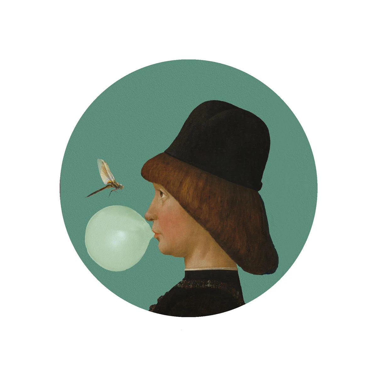 Tauchen Sie mit Punkten in die künstlerische Erzählung ein - Junge und Libelle, ein rundes Wandgemälde, das ein Renaissance -Porträt mit einem Jungen und einem zeitgenössischen Element in Form einer Libelle kombiniert. Ideal für diejenigen, die eine einzigartige Kombination aus Geschichte und Moderne in ihrem Innenraum schätzen.