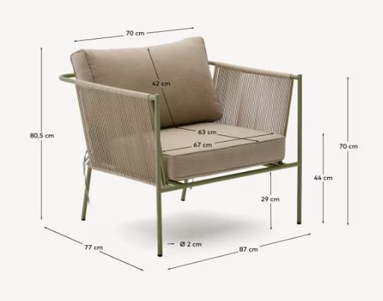 Zivia zu Sessel Mit einem minimalistischen Design, das harmonisch Ausdauer und Stil kombiniert. Die in einem grünen Finish aufgebrachte Stahlkonstruktion bietet Beständigkeit gegen Korrosion und Rost und macht es zu einer haltbaren und zuverlässigen Wahl für externe Räume. Die von handgefertigte Rückenlehne aus handgefertigten, synthetischen UV -resistenten Seil betont seinen modernen Charakter und macht es nicht nur stilvoll, sondern auch äußerst komfortabel.