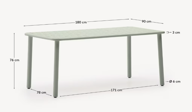 Brai es Gartentisch, was moderne Ästhetik mit hoher Funktionalität kombiniert. Es besteht aus türkisfarbenem, verzinktem Stahl und ist gegen Abrieb und Korrosion beständig, was seine Haltbarkeit auch bei anspruchsvollen externen Bedingungen gewährleistet. Plastikbeinschutz schützen die Bodenoberfläche vor Kratzern und garantieren die Stabilität auf verschiedenen Substraten.