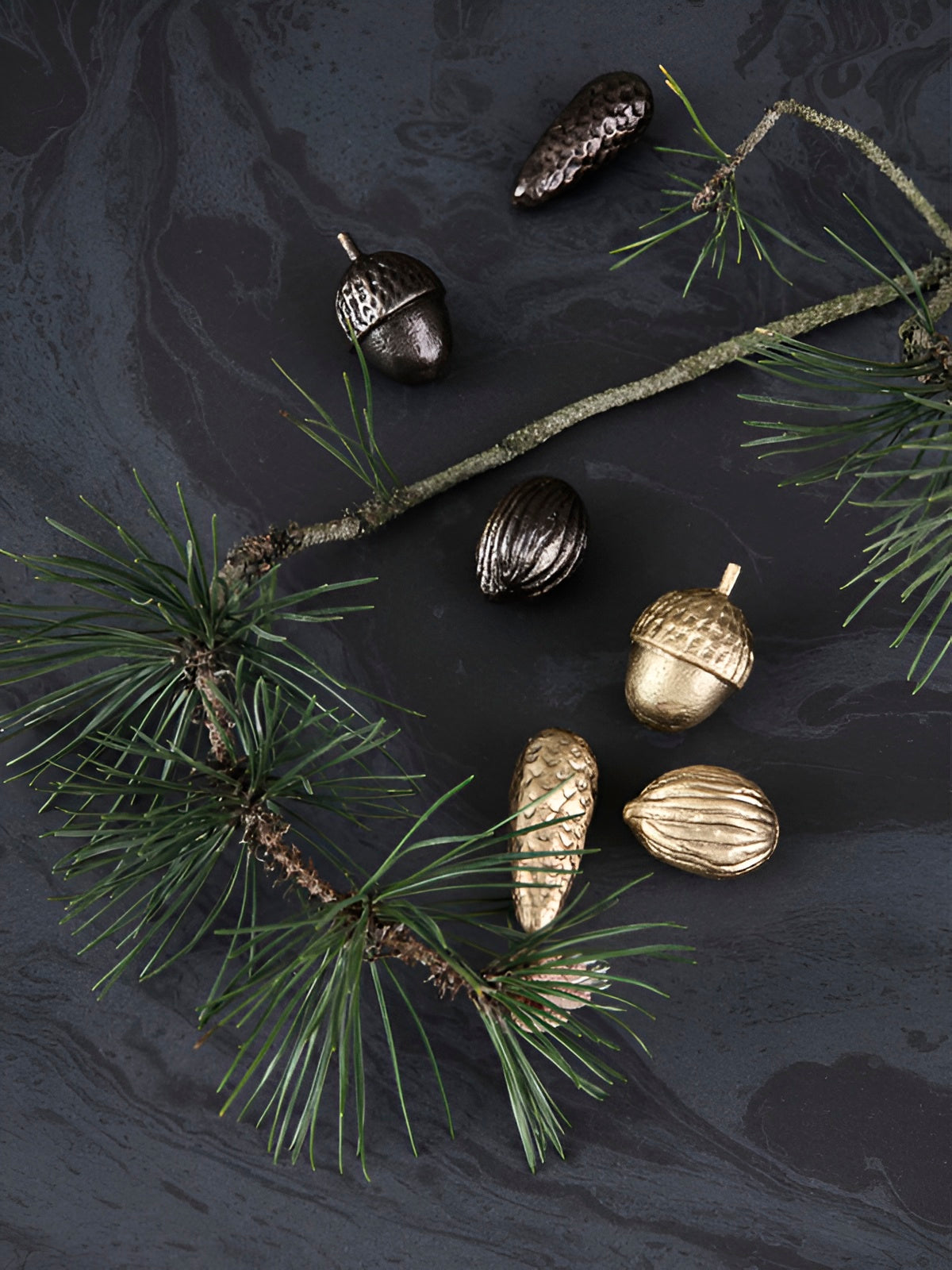 Dekoracyjny zestaw Winterland Forest Treats to subtelny sposób na wprowadzenie do wnętrza świątecznego klimatu inspirowanego naturą. Zestaw składa się z trzech precyzyjnie wykonanych figurek – żołędzia, szyszki i orzecha – odlanych z litego mosiądzu w eleganckim, czarnym wykończeniu. Każdy element zachwyca dbałością o detale i realistycznym odwzorowaniem naturalnych kształtów, tworząc harmonijną dekorację o ponadczasowym charakterze.