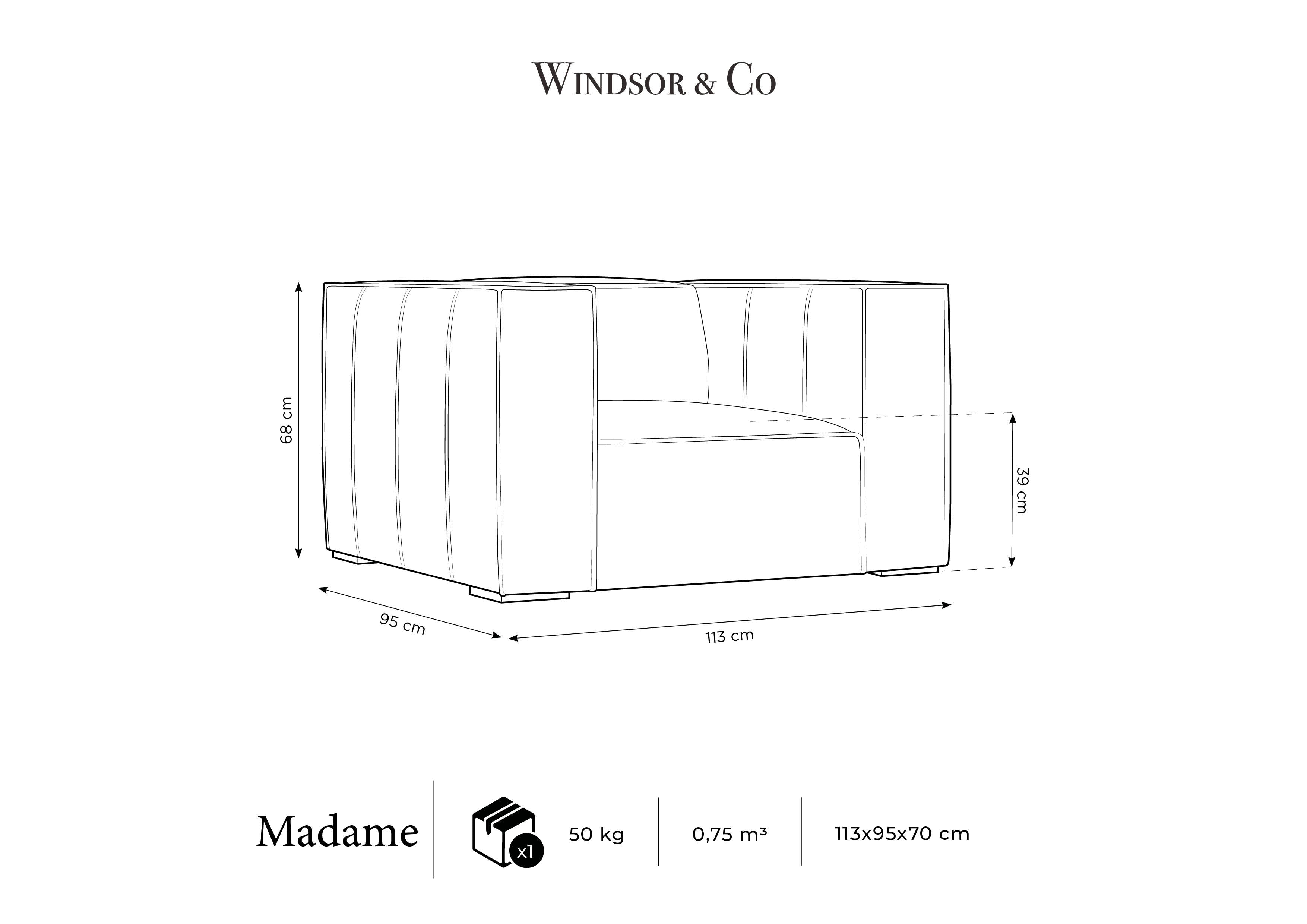 Sessel Madame mit einem ausgeprägten Charakter und einem eleganten Finish ist eine gute Wahl für ein modernes Wohnzimmer. Der tiefe Sitz eignet sich sowohl für soziale Versammlungen als auch bis zu einem Moment der Entspannung nach einem harten Tag. Sie können bequem in freien Positionen ruhen. Mit einer niedrigen Figur, breiten Armlehnen und Rücken erzeugt es einen gemütlichen Block.