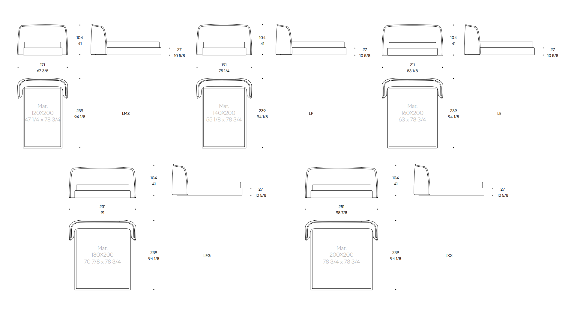 Design Betten Caillou konzentriert sich auf zwei Hauptkonzepte: die Weichheit der Linie und die Raffinesse der Materialien, aus denen sie hergestellt wird. Die mit einem Trimming dekorierte Kopfstütze bedeckt den gesamten gepolsterten Rahmen und erzeugt einen effektiven Effekt. Es sind verschiedene Größen erhältlich, von Single zu Quadrat und eineinhalb bis zu Doppelgänger, um den vielfältigen Bedürfnissen unserer Kunden zu erfüllen.