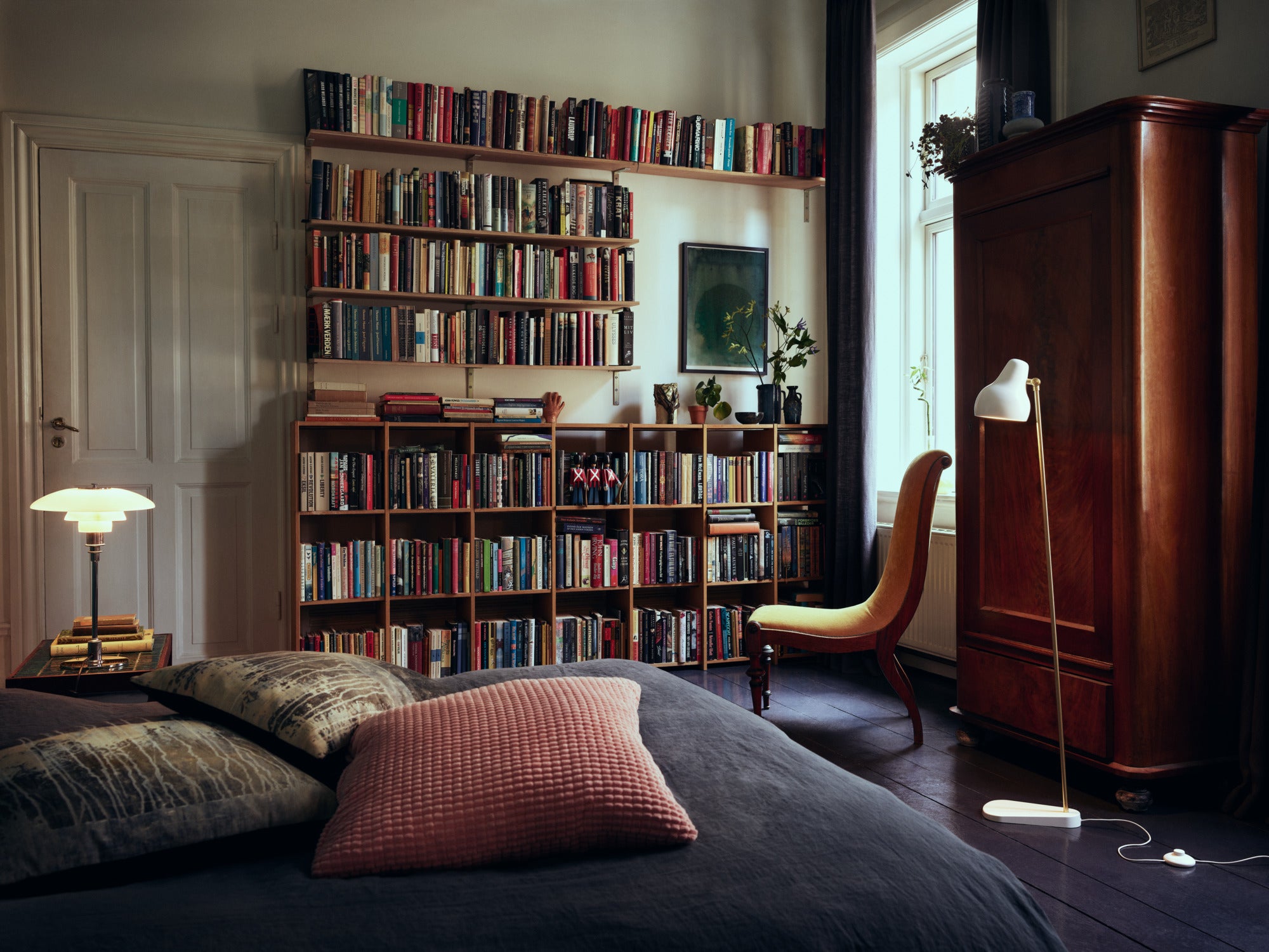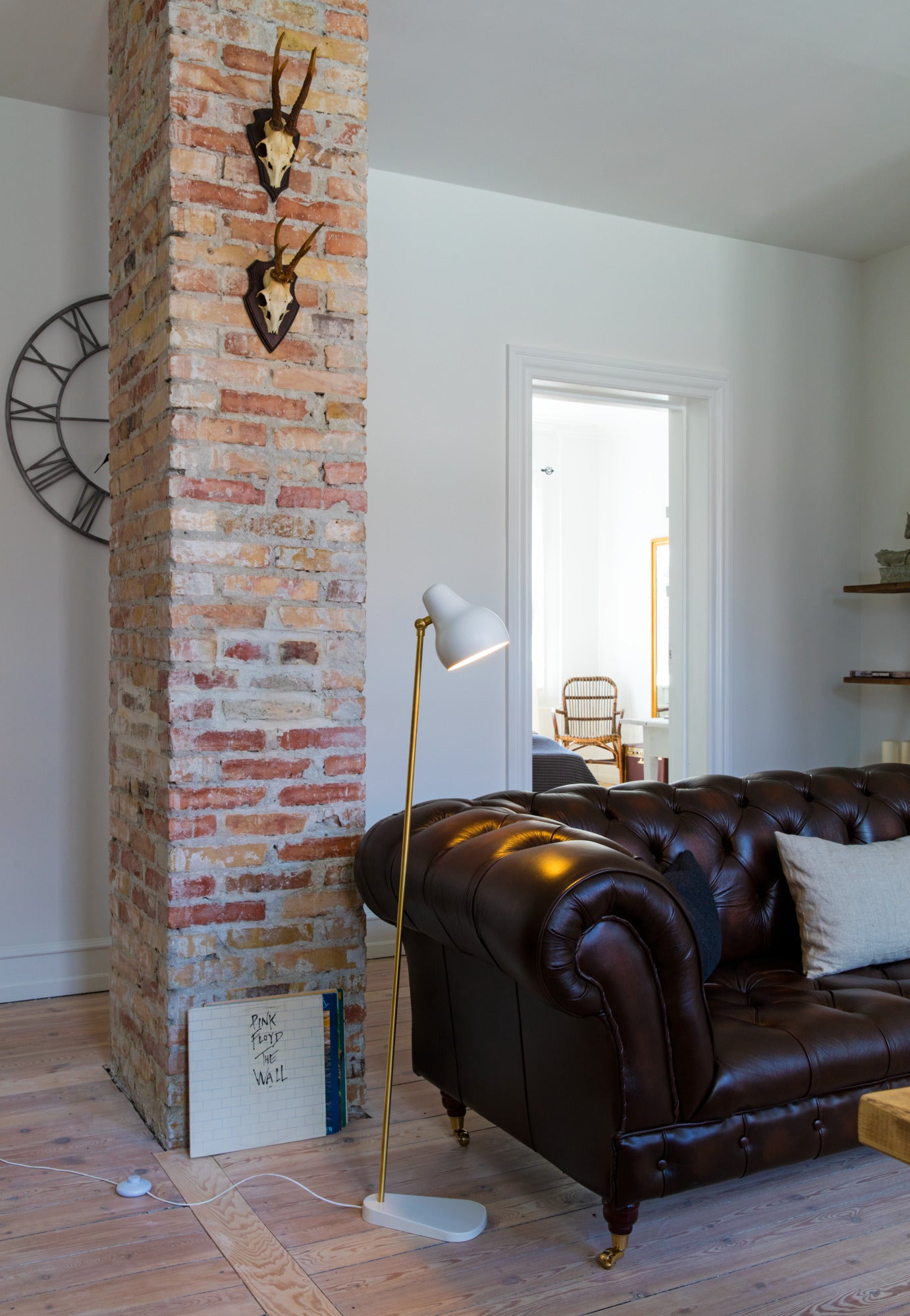 Stehlampe VL 38 sorgt für warmes, nach unten gerichtetes Licht, das ideal zum abendlichen Lesen oder zur Schaffung einer stimmungsvollen Atmosphäre im Wohnzimmer ist. Die innere, weiße Beschichtung des Schirms streut das Licht auf subtile und natürliche Weise, und der verstellbare Neigungswinkel ermöglicht es, die Beleuchtung an die Bedürfnisse anzupassen. Im Laufe der Zeit bedecken sich die Messingelemente mit einer zarten Patina, wodurch jede Stehlampe einen einzigartigen Charakter erhält.