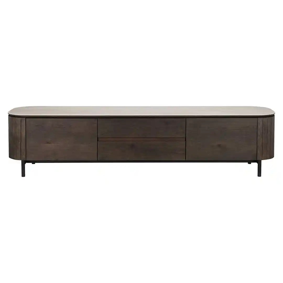 Eleganter RTV-Schrank Ritz in braun ist eine Kombination aus modernem Design und Funktionalität, die in jedem Wohnzimmer hervorragend zur Geltung kommt. Ihre abgerundeten Kanten verleihen ihr eine subtile Note, während die durchdachte Konstruktion mit Schränken und Schubladen praktischen Stauraum bietet. Die minimalistische Form und die edle Verarbeitung sorgen dafür, dass das Möbelstück perfekt in moderne, klassische und industrielle Arrangements passt.
