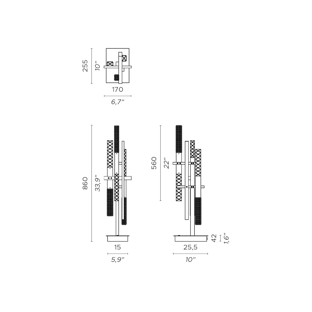 Gekennzeichnet durch eine Kombination von rechteckigen Messingrohren und schrägen Würfeln aus graviertem Kristall, Tischlampe Mikado verleiht dem Innenraum Stil.