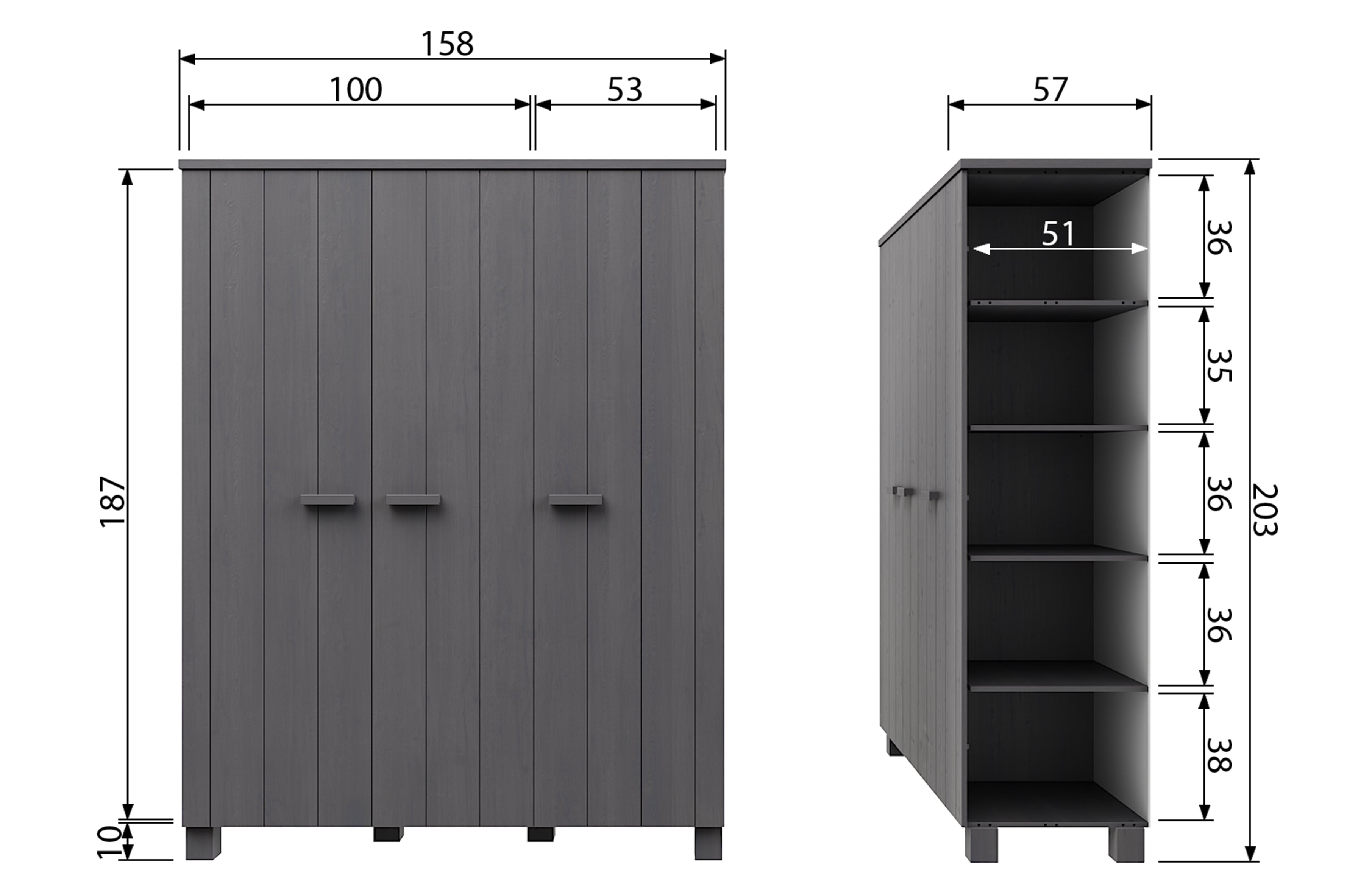 Die Dennis -Garderobe besteht aus dauerhaften Materialien, die ihre Langlebigkeit und Haltbarkeit gewährleisten. Drei Türen öffnen sich leicht und enthüllen Sie den Stauraum, der kräftig genug ist, um alles, was Sie brauchen, von Kleidung bis hin zu Bettwäsche oder Handtüchern zu ermöglichen.