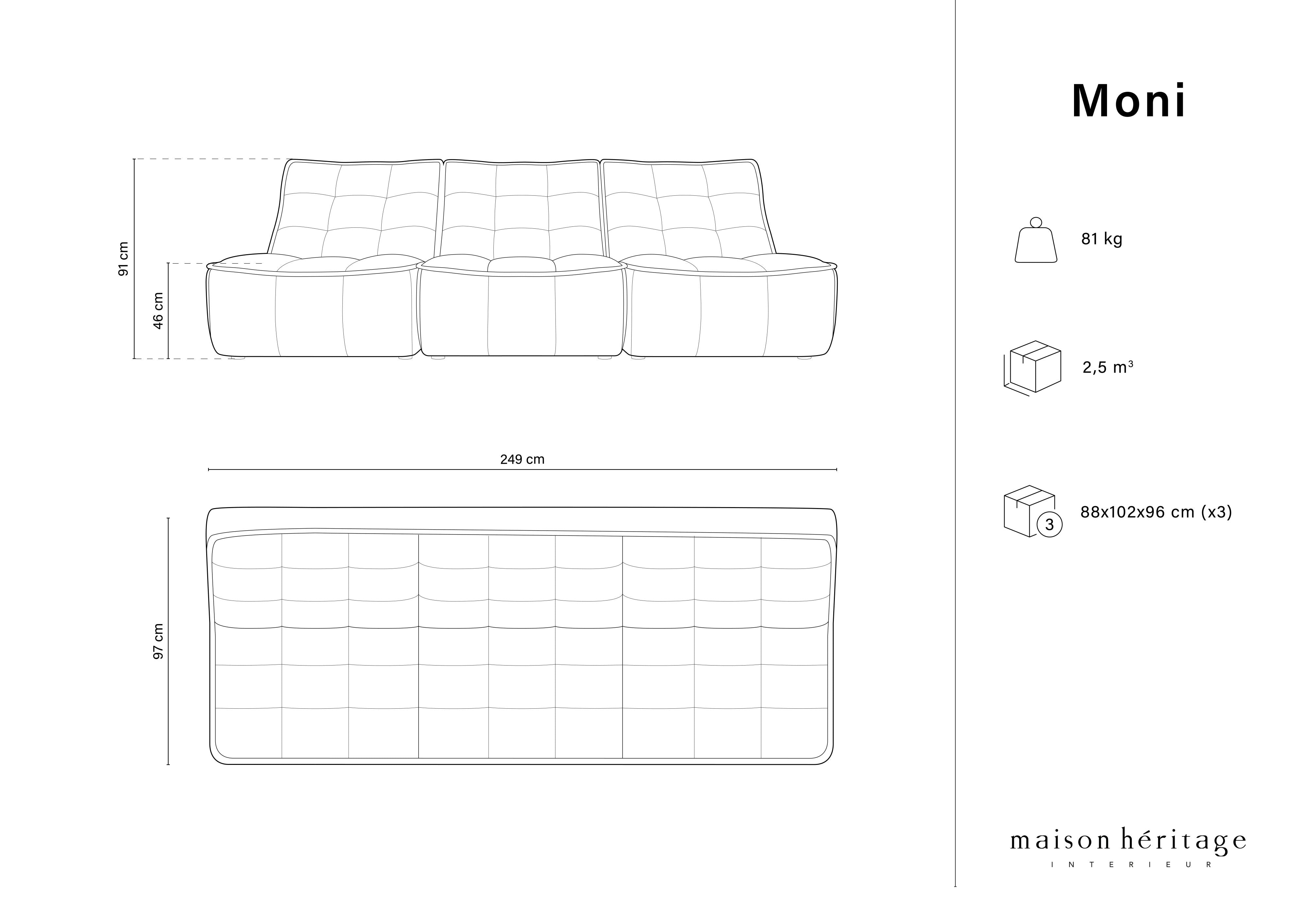 Sofa for three people Moni defines functionality and convenience in combination with modern design. Stylish quilting and the original block are great for both an elegant living room and a modern office. The seat and back line is arched and has a slightly profiled cavity, offering extraordinary comfort of use.