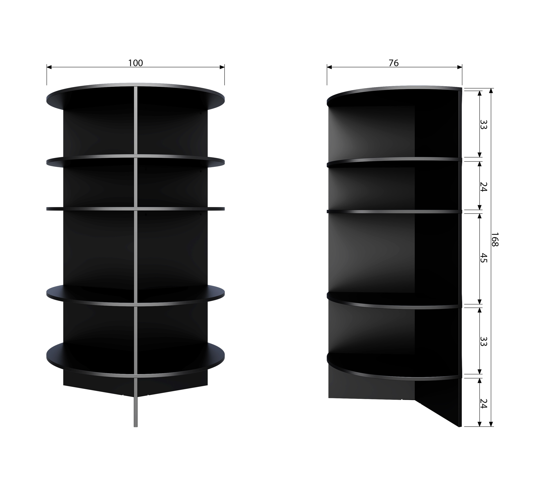 Rack The trian was made of certified pine wood and finished in deep black. This unique piece of furniture combines open compartments and round shape, creating a stylish whole, while offering a lot of space for storing the most beautiful accessories.