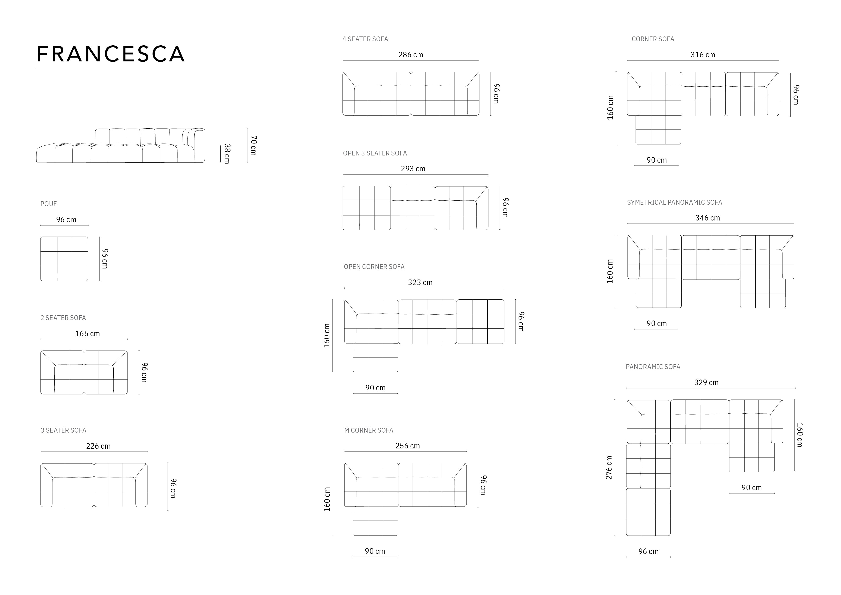 Pay attention to careful stitching that emphasize elegant design. In the Francesca collection you will find various combinations of pouf, simple, corner and panoramic sofas that will allow you to adapt furniture to your vision.