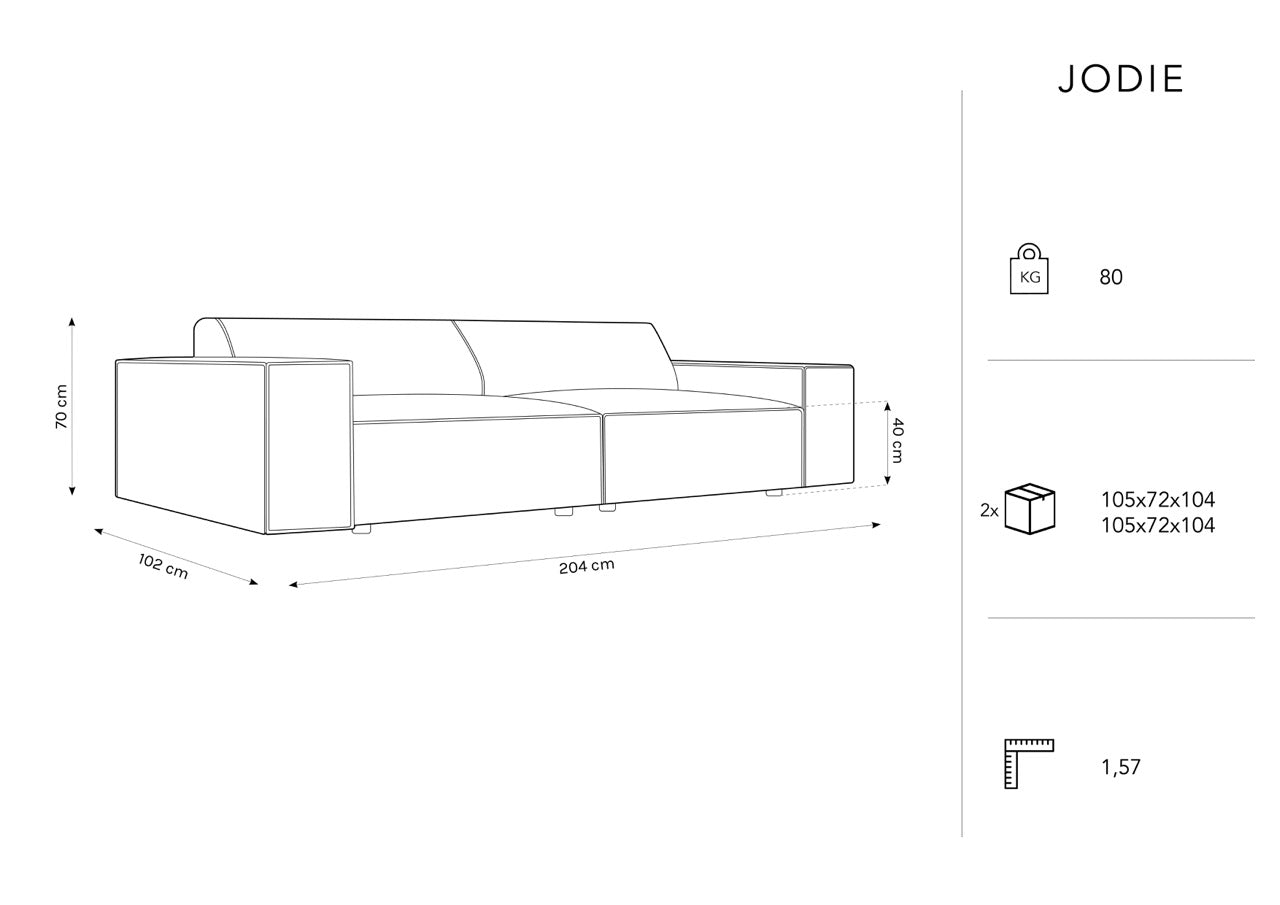 Sofa for three people Jodie is not only a comfortable seat, but also an element of decor that adds elegance to the interior. It was made of high quality velvet fabric, which guarantees not only excellent comfort, but also the long -term life of the furniture. A comfortable seat and backrest ensure excellent conditions for relaxation and rest, and wide armrests allow free lounging and comfortable hand support.