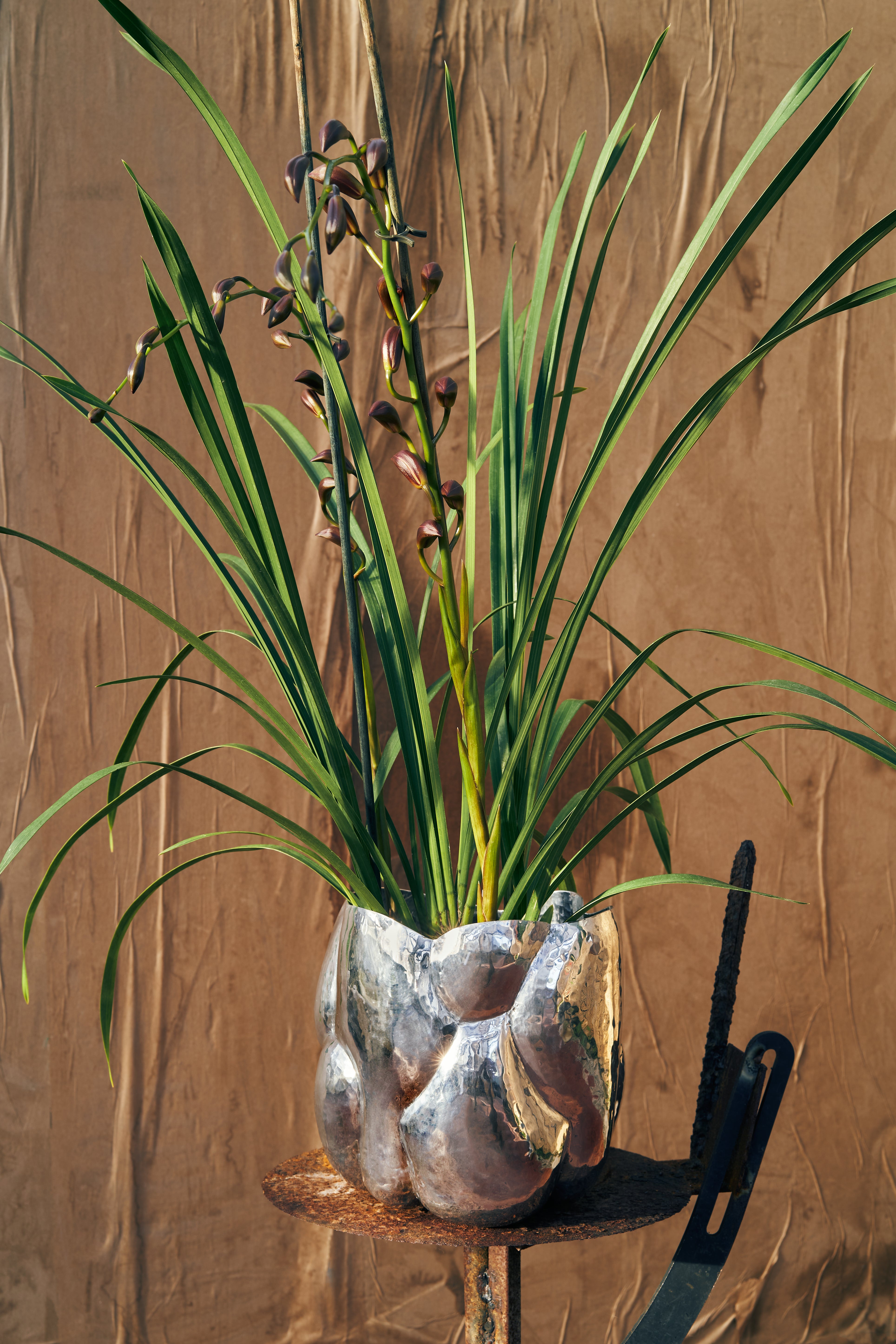 Cloud is a sculptural vase Made of highly polished aluminum with a mirror finish. Each copy is manually created by qualified craftsmen in India, thanks to which everyone has unique features. Hammer traces, subtle deformations and delicate welds emphasize manual performance and give it an artistic character.