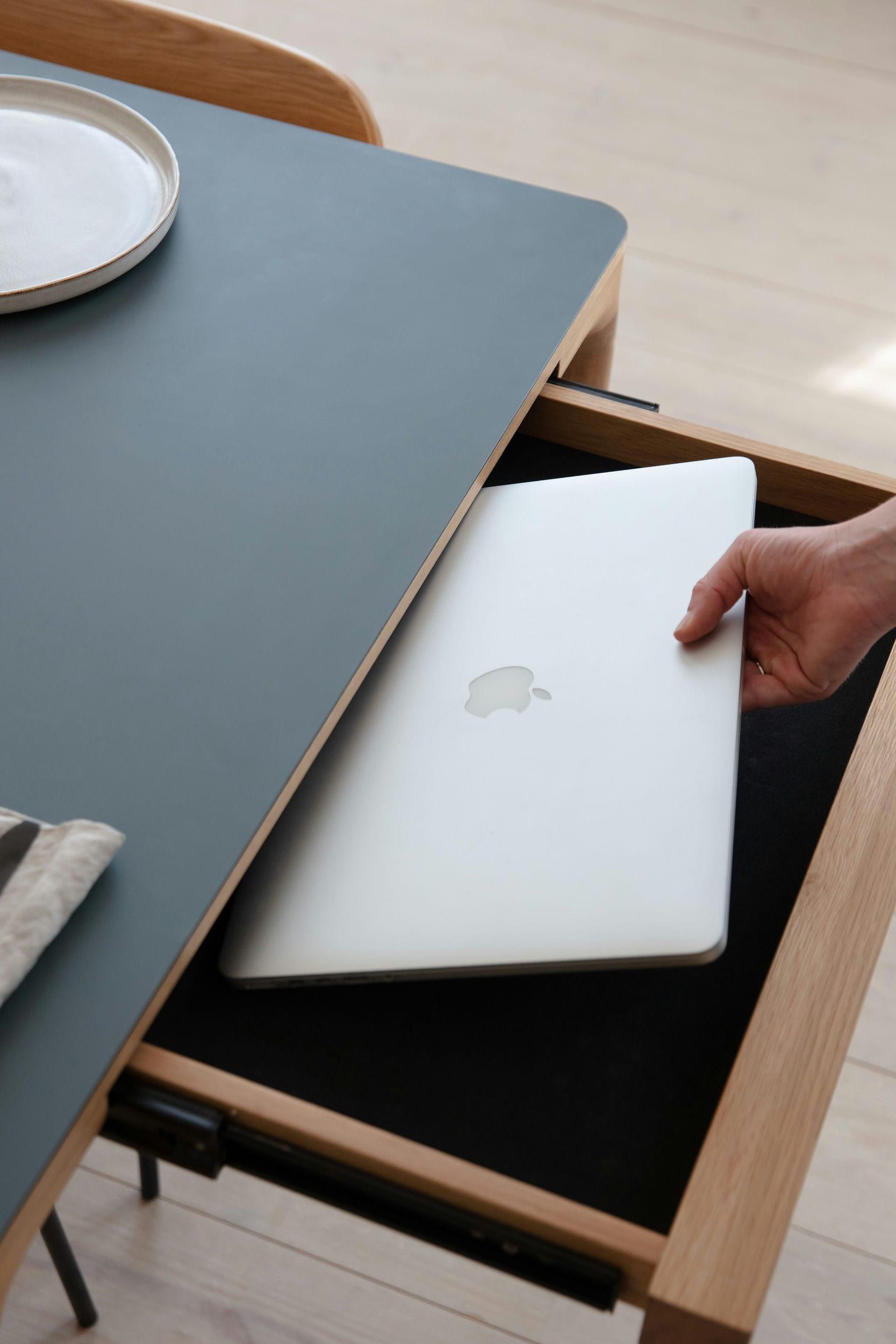 Both ends of the table hide two drawers padded with delicate fabric, allowing you to quickly hide all disorder and traces, which sometimes leaves everyday life behind. These two drawers also act as handles for two prolonged plates, ensuring table stability even after its development. The extension plates are discreetly hidden at the table and can be easily added or removed depending on your needs.