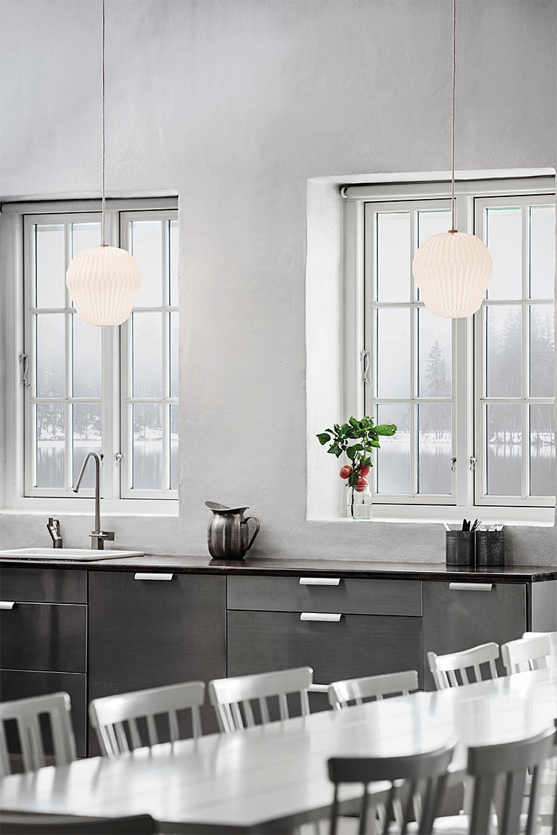 The lamp is available as a single pendant, but it is also offered as a chandelier with three, five, or seven shades. This is an excellent option for those seeking elegant yet subtle lighting that will bring harmony and warmth to the interior.