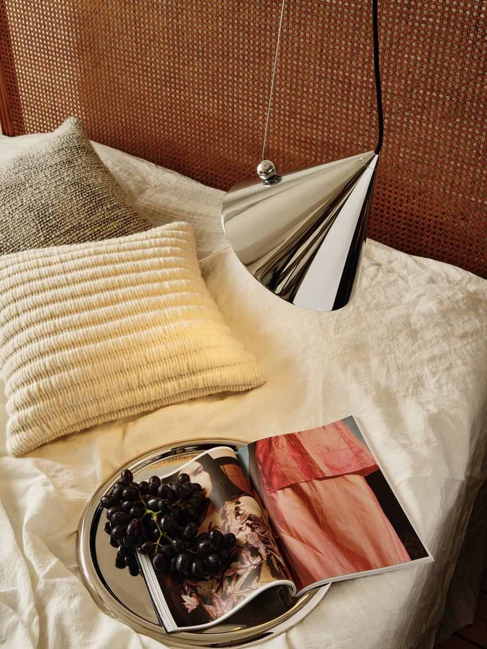 Pendant lamp Pose is a sculptural form designed in a London studio, inspired by the balance of conical shapes and principles of optics. Thanks to the use of a Fresnel lens, the pendant lamp offers precisely directed light, perfect for illuminating tables, kitchen islands, or selected areas of the interior. The magnetic, polished sphere and chrome ball joint allow for accurate adjustment of the light direction, enabling the pendant lamp to be tailored for ambient, background, or accent lighting.