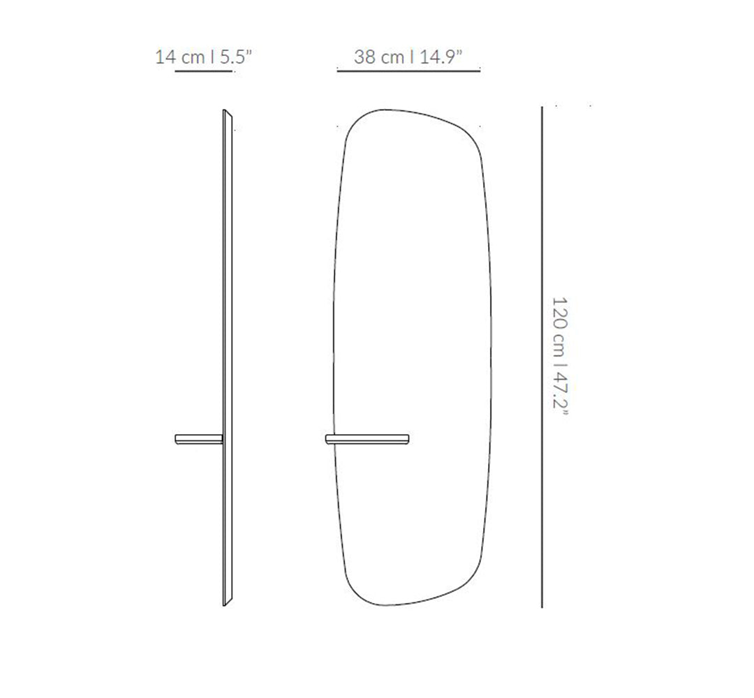 Wall Mirror Pared is an elegant choice for modern and timeless interiors, combining a sleek form with functional detail. The subtle surface is complemented by a handcrafted wooden shelf, making this designer mirror not only reflect light but also provide a convenient place to set down keys or small accessories.