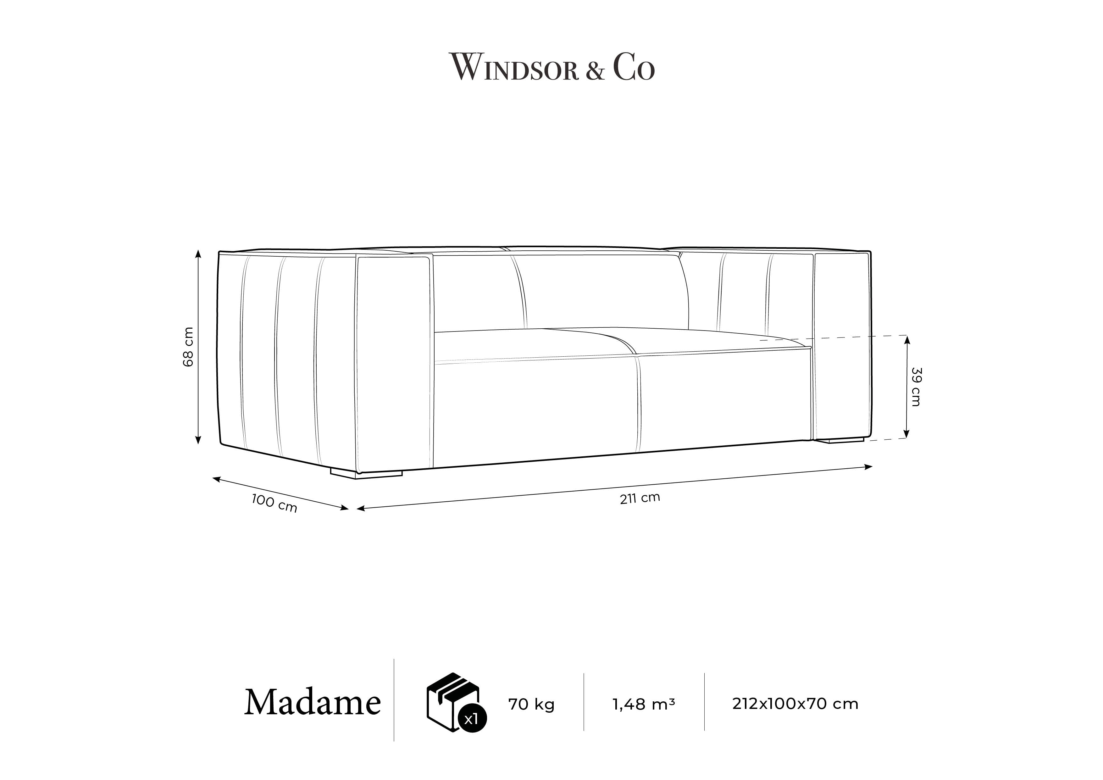 Sofa for two people Madame with a distinct character and an elegant finish is a great choice for a modern living room. The deep seat is both perfect for social gatherings and until a moments of relaxation after a hard day. It allows you to conveniently rest in free positions. With a low -set figure, wide armrests and backs, it creates a cozy block.
