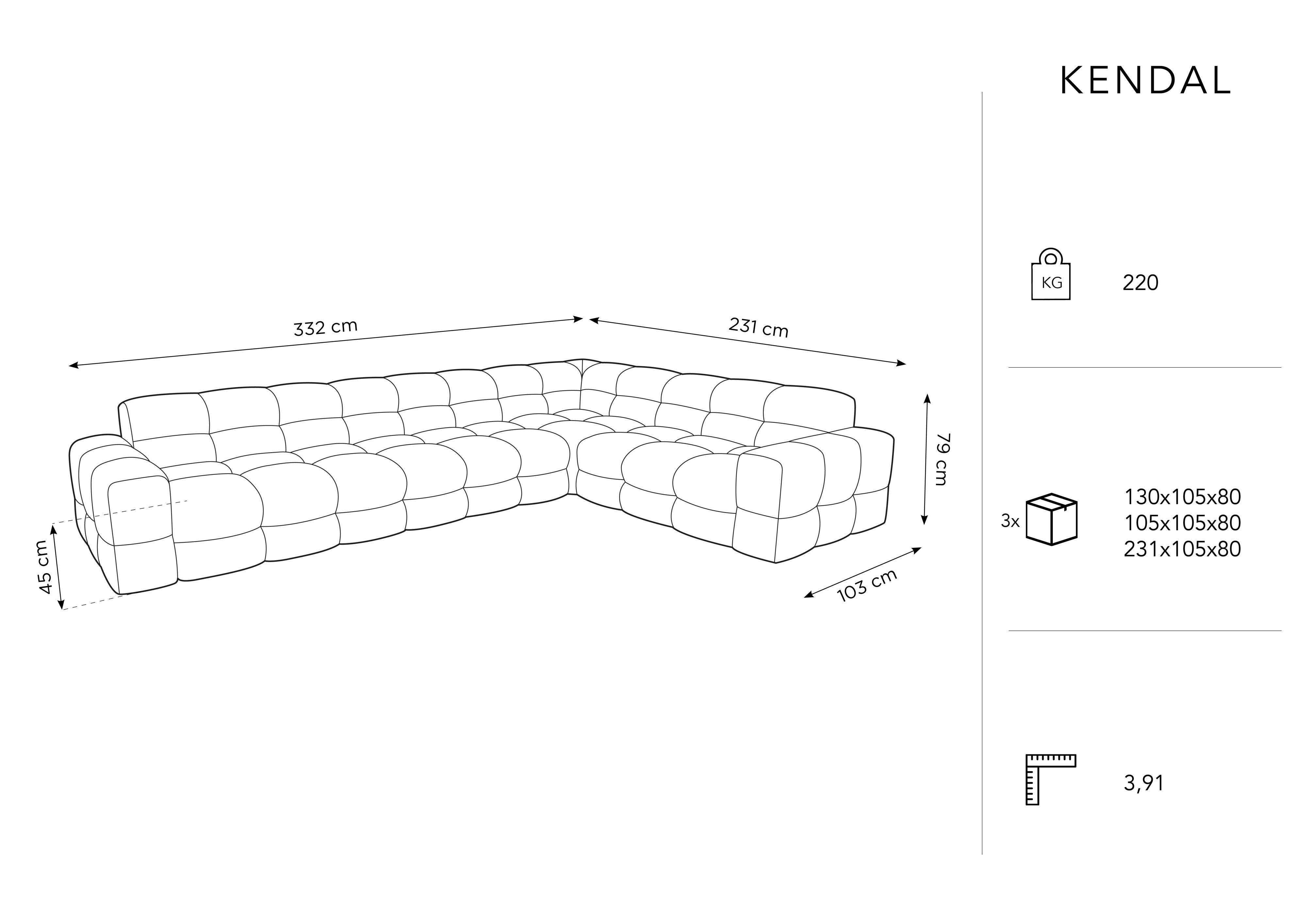 Velvet corner for six people Kendal impresses with extraordinary stitching and quilting, which will add the interior an unusual elegance in the style of modern classic. The bubble seat in combination with a stylish support and wide armrests creates a comfortable place to relax after a hard day. Kendal surprises a bit with the avant -garde form and attracts attention, regardless of which side we will look at it.