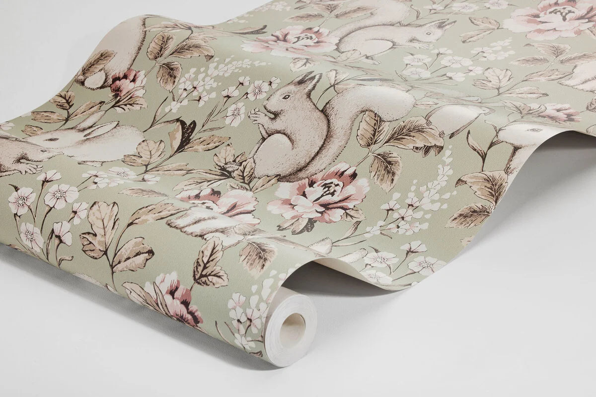 Children's wallpaper with a plant and animal theme MAGIC FOREST light green