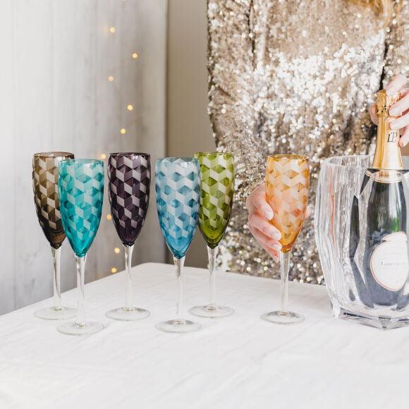 Brille Für Champagner bestand Blöcke aus hochwertigem farbigem Glas, das nicht nur gut aussieht, sondern auch Blöcke gläser und funktional ist. Die Brille hat ein geschliffenes Muster, das an einen Block erinnert, was eine Inspiration für den Namen der Sammlung war. Die ideale Größe des Griffs bedeutet, dass die Blöcke mit Brillen nicht nur eine Dekoration, sondern auch ein praktisches ideales Element für Partys ist.