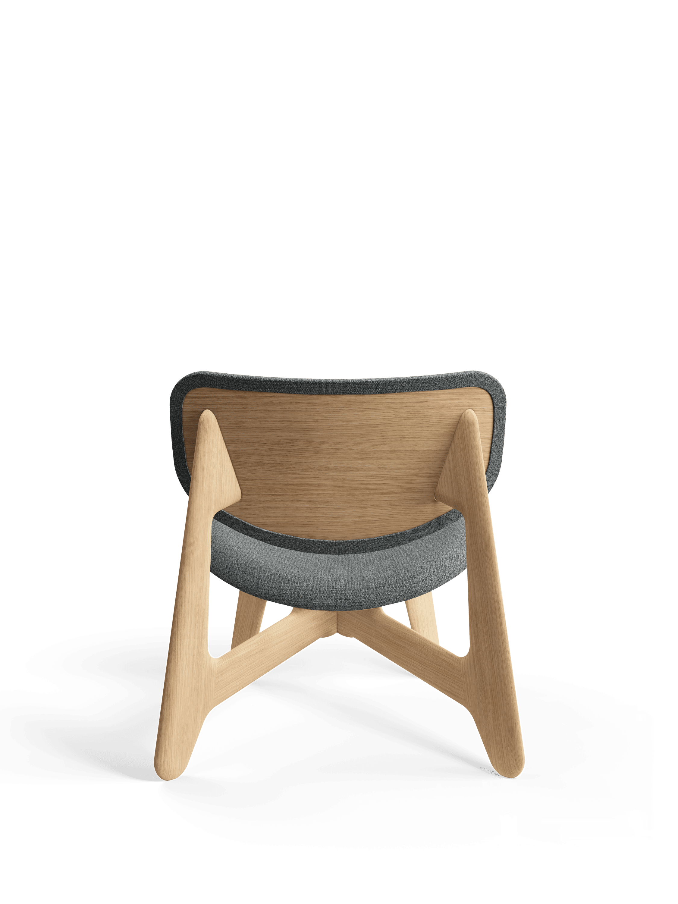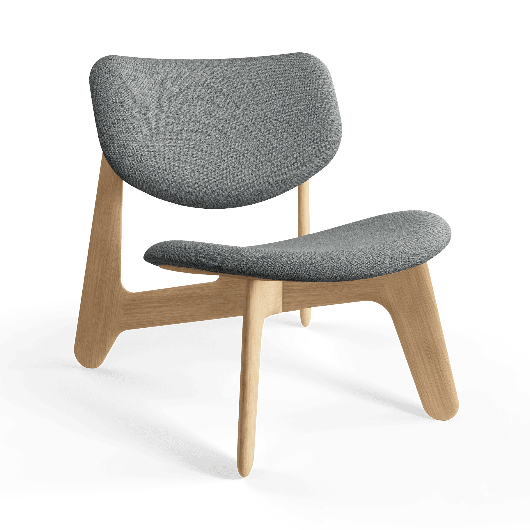 Sessel Slab ist ein niedrig sitzendes Möbelstück, das die natürliche Eleganz von tief gebürstetem Eichenholz feiert. Dieser Sessel zeichnet sich durch eine solide Konstruktion, sanft abgerundete Kanten und harmonische Proportionen aus, die ihm einen grafischen und gleichzeitig einladenden Charakter verleihen. Der gepolsterte, ovale Sitz bietet Komfort, und das Gesamtbild schafft eine ausgewogene Verbindung von der Rohheit des Holzes und der Weichheit der Stoffe.