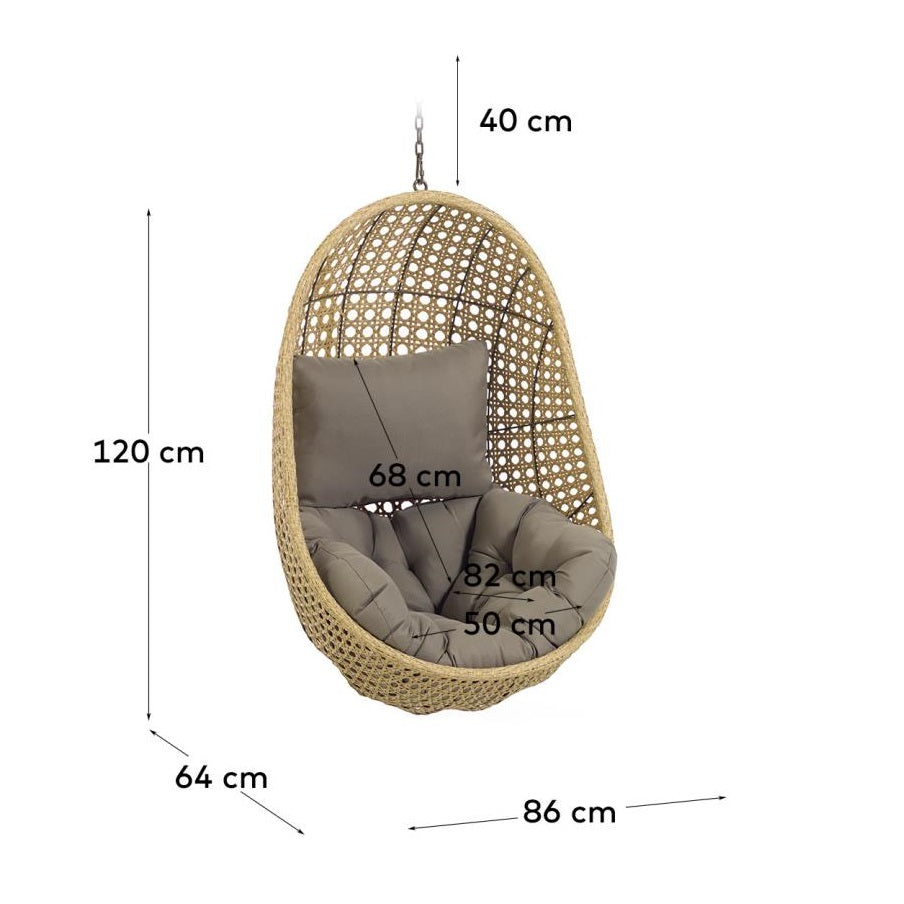 Lehnen Sie sich bequem in die angeschlossenen Kissen zurück und spüren Sie, wie alltägliche Momente der Entspannung extrem bequem werden. Designer hängender Sessel CIRA ist nicht nur ein Möbelstück, sondern auch eine Möglichkeit, sich zu entspannen und von natürlichen Elementen umgeben zu ruhen. Dank seines soliden Designs und seiner Materialien können Sie es für viele Jahreszeiten genießen, unabhängig von den Wetterbedingungen.