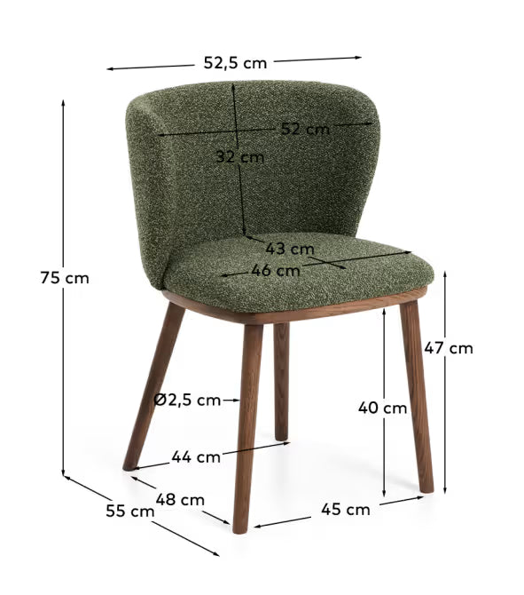 Stuhl Ciselia vereint eine sanfte Form mit einer natürlichen Holzoberfläche und schafft so ein harmonisches und elegantes Element für Ihr Zuhause. Der Bezug aus dickem Chenille verleiht ihm eine angenehme, umhüllende Struktur, die Wärme und Ruhe in den Raum bringt. Die Beine aus massivem Eschenholz in Nussbaum-Finish betonen den zeitlosen Charakter des Möbels und sorgen für Stabilität. Dieses gepolsterte Modell eignet sich hervorragend für den Esstisch, im Wohnzimmer oder in einem offenen Küchenbereich.