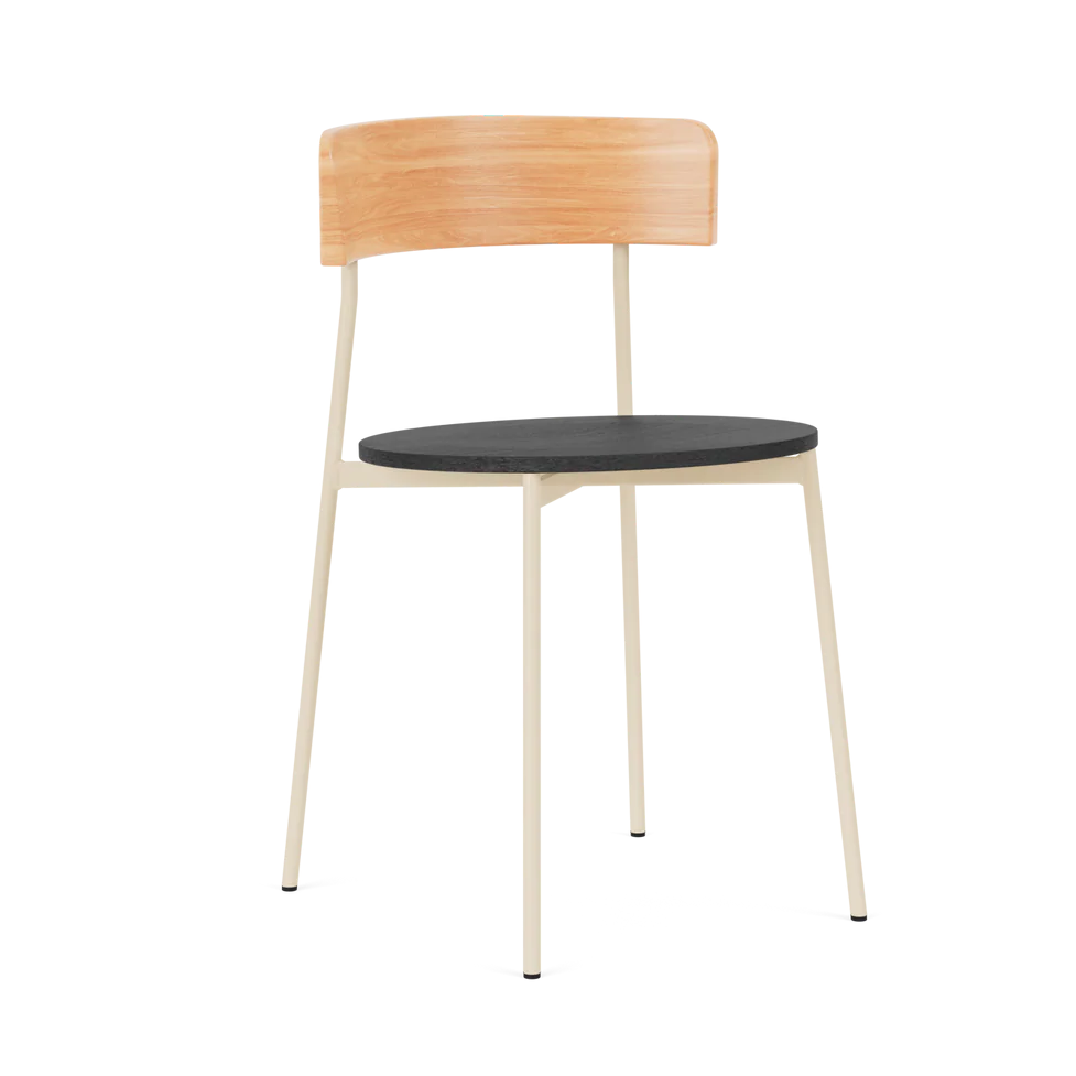 Stuhl FRIDAY mit schwarzem Sitz, Holzrückenlehne und beiger Basis