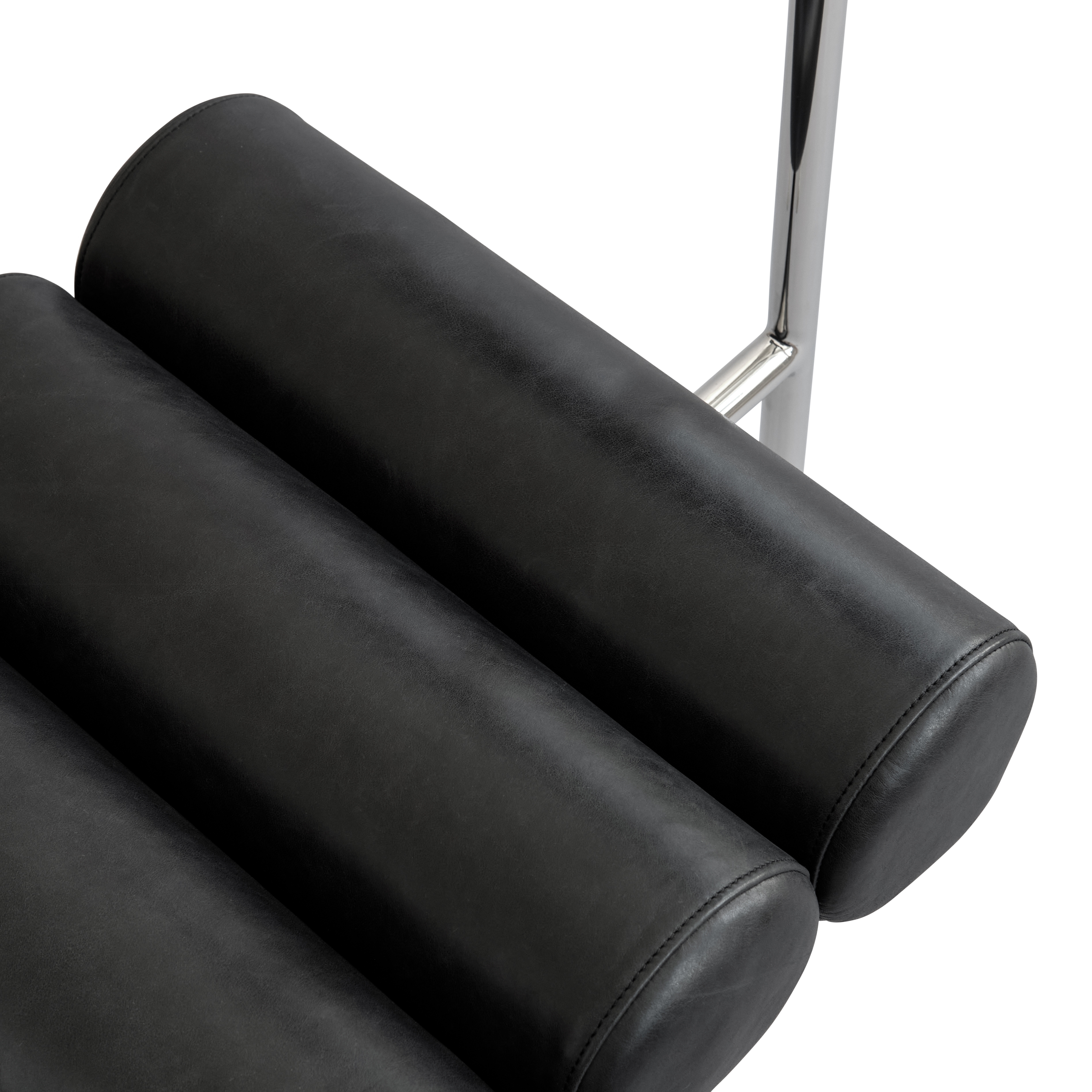 Der Stuhl Hiro vereint eine schlichte Form mit raffinierten Details. Vier zylindrische Elemente bilden seine Sitzfläche und Rückenlehne und fügen sich zu einer Komposition zusammen, die einerseits roh und andererseits deutlich skulptural ist. Drei schlanke Beine aus Edelstahl verleihen dem Ganzen Leichtigkeit und stehen im Kontrast zu der markant ausgeprägten Form der gepolsterten Zylinder. Der schwarze Bezug aus hochwertigem Anilinleder verleiht dem Stuhl Tiefe und Eleganz und betont seinen grafischen Charakter. Die Rückenlehne, die an einen Griff erinnert, zieht nicht nur die Blicke auf sich, sondern erleichtert auch das Umstellen des Möbels im Raum – ein subtiler funktionaler Gestus, der in die Form integriert ist.