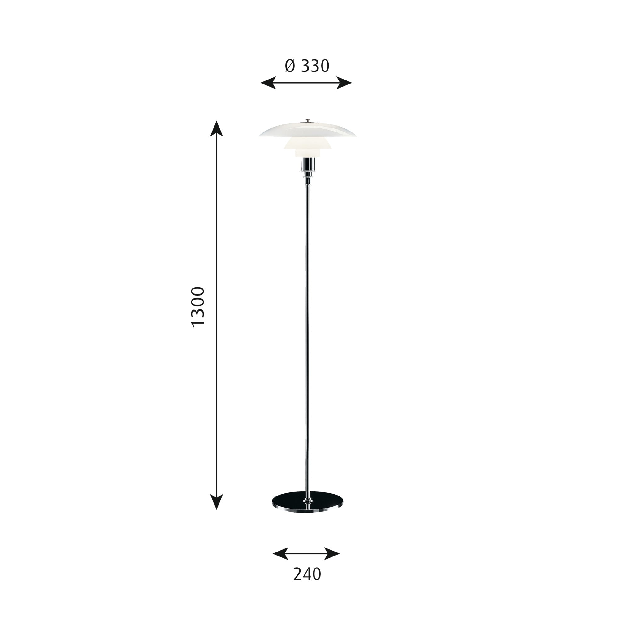 Stehlampe PH 3½-2½ ist ein zeitloses Beispiel dänischen Designs, in dem Funktionalität auf Eleganz trifft. Das Design von Poul Henningsen basiert auf dem ikonischen, dreischirmigen System, das in den 1920er Jahren geschaffen wurde. Dank dessen strahlt die Lampe weiches, harmonisches Licht aus, das nicht blendet und den Raum subtil erhellt. Das dreilagige opale Glas, mundgeblasen, garantiert angenehme, diffuse Beleuchtung, und der zarte Glanz des Glases verleiht dem Ganzen eine außergewöhnliche Leichtigkeit und Klasse.