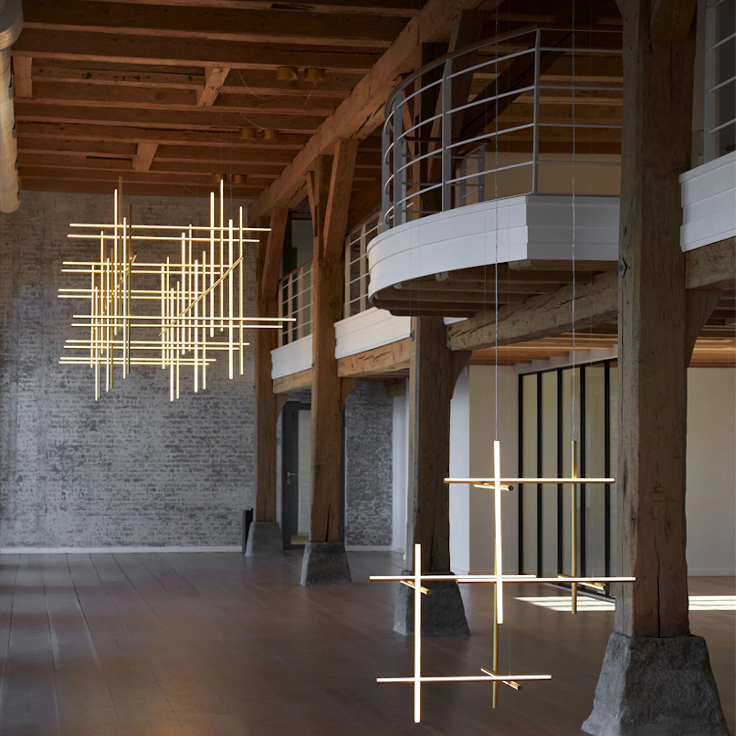 Die Pendelleuchte Coordinates CL III ist für die Installation mit externem Stromanschluss geeignet, was es ermöglicht, das Netzteil an einem anderen Ort zu verstecken und maximale Formreinheit zu erreichen. Die Profile werden mit schlanken Kabeln montiert, und spezielle mechanisch-elektrische Verbindungen ermöglichen eine schnelle Montage und präzise Aufhängung der gesamten Konstruktion. Dadurch behält Coordinates seinen leichten, schwebenden Charakter selbst in den anspruchsvollsten Arrangements.