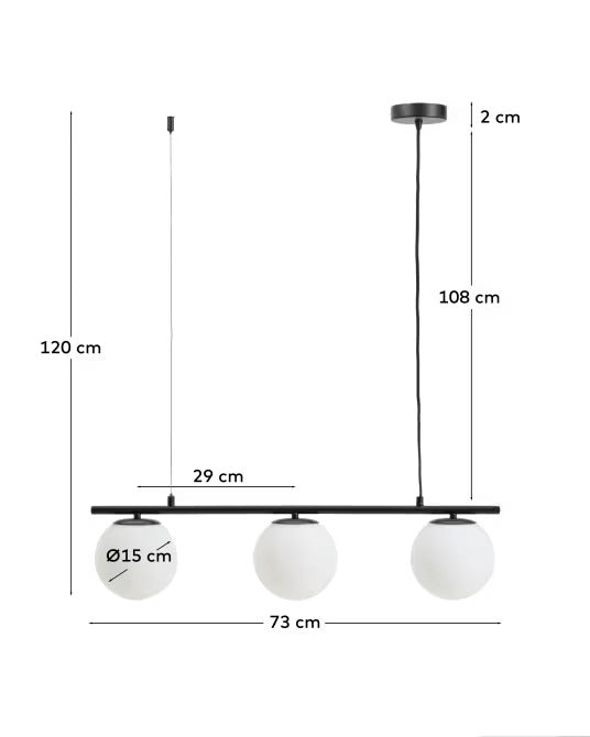 Pendelleuchte Brisia vereint geometrische Präzision mit Eleganz und bietet ein zeitgenössisches Design, das auf der Harmonie von Materialien und Formen basiert. Ihre metallische Konstruktion in schwarzer Ausführung bringt einen Hauch von Raffinesse in den Raum, während der kugelförmige Schirm aus mattem Glas das Licht sanft streut und eine stimmungsvolle, umhüllende Beleuchtung schafft. Dadurch betont die moderne Lampe perfekt den Charakter des Raumes – von minimalistischen bis hin zu dekorativeren Arrangements.