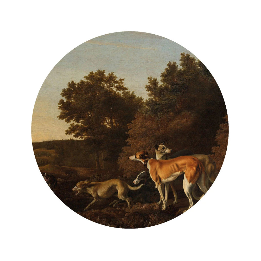 Wandgemälde Dots Chart ist eine Wanddekoration in Form eines Kreises, die eine klassische Jagdszene mit Hunden vor einer natürlichen Landschaft darstellt. Das Motiv, inspiriert von traditioneller Malerei, bringt Eleganz, Edelmütigkeit und zeitlose Charakteristik in den Raum. Zarte Farben und die illustrative Form verleihen der Komposition einen besonderen Charme und schaffen eine Dekoration, die Geschichte mit künstlerischer Ästhetik verbindet.