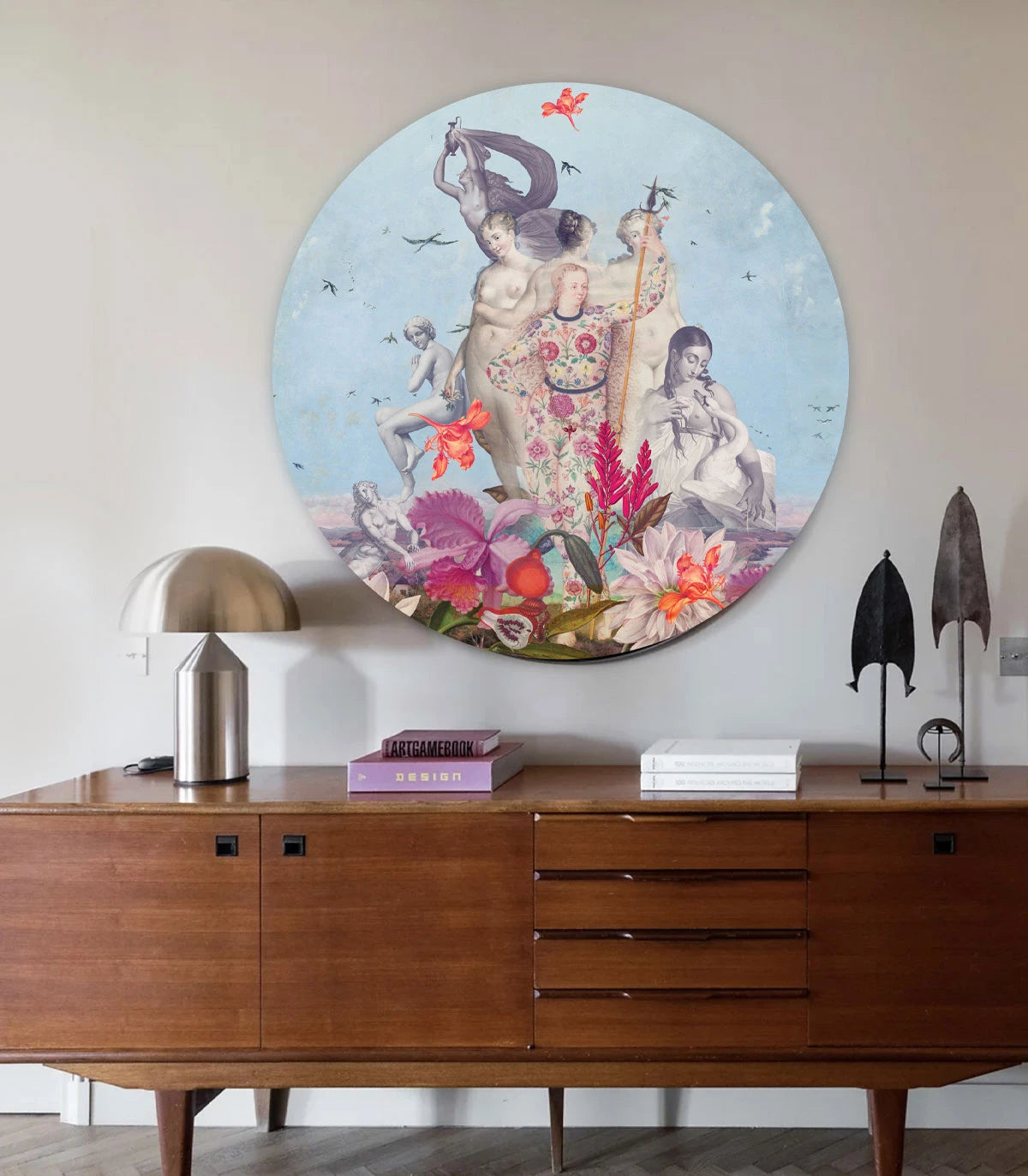 Wandbild in Kreisform DOTS - JUNGE MIT KAUFMAULBEERE blau