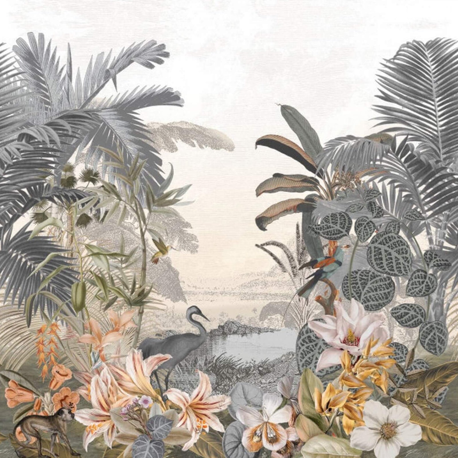 Textilwandbild mit exotischer Landschaft PARAIBA, gedämpftes Blau mit Beige