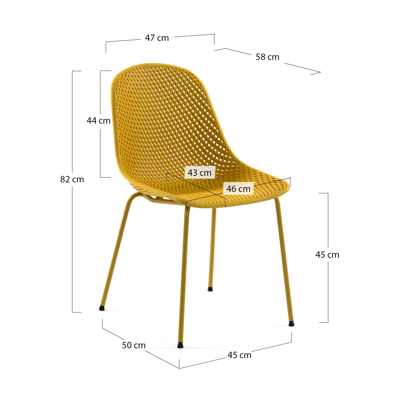 Das Metalldesign des Quinba -Stuhls gewährleistet außergewöhnliche Stabilität und Stärke und garantiert den Komfort für viele Jahre. Dank seiner Vielseitigkeit, gelber Stuhl Quinby eignet sich perfekt für die Innenseite der Räume und draußen. Es ist ein multifunktionales Element, das seine Verwendung sowohl in Wohngebieten, Büroflächen als auch im Garten oder auf der Terrasse findet.