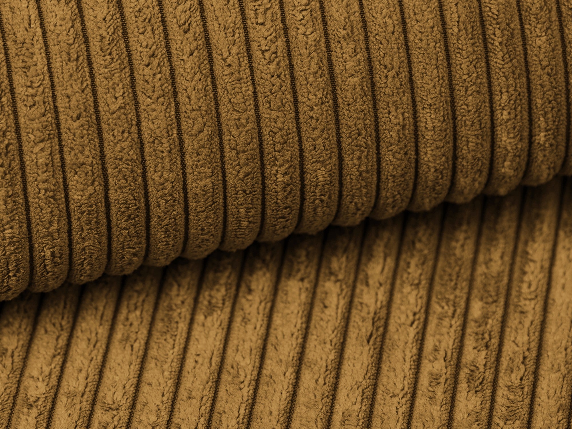 Tkanina sztruksowa zastosowana w sofie Kalena wyróżnia się wyrazistą, trójwymiarową strukturą o grubych żebrach, które nadają meblowi przytulny i nowoczesny charakter. Dzięki dłuższemu włosiu materiał jest wyjątkowo miękki i przyjemny w dotyku, a zarazem odporny na ścieranie, co potwierdza wynik 35 000 cykli w teście Martindale’a. Tkanina ta doskonale sprawdza się również w domach, w których mieszkają zwierzęta, ponieważ jej struktura i skład są przystosowane do codziennego kontaktu z pupilami. Sztruks nie tylko podnosi komfort użytkowania mebla, ale również sprawia, że sofa prezentuje się ciepło i stylowo.