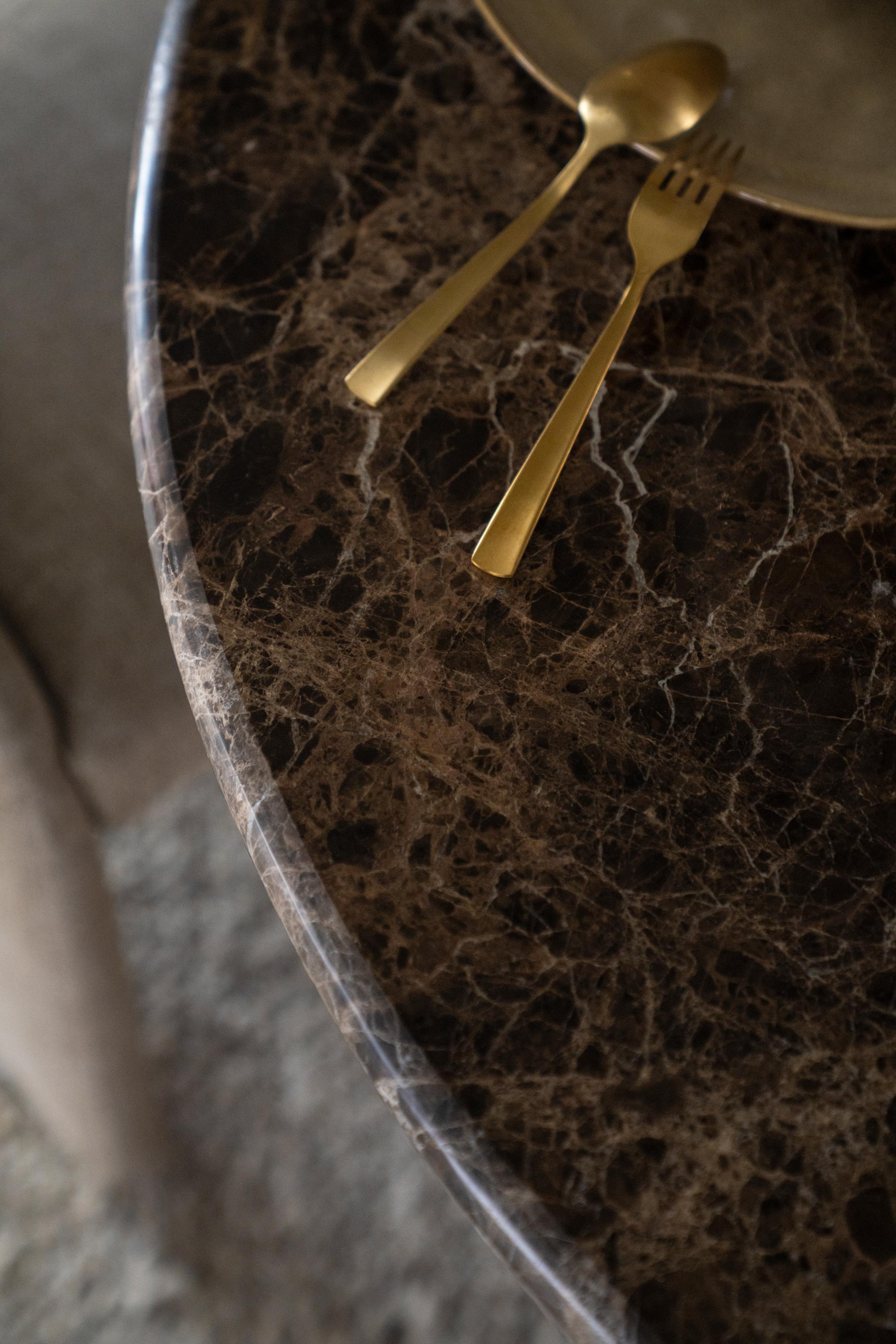 Der Tisch Lando ist ein äußerst elegantes Element für das Esszimmer, das den luxuriösen Charakter von Marmor mit der Wärme von natürlichem Holz verbindet. Die runde Tischplatte aus dunkelbraunem Emperador-Marmor begeistert mit ihrer reichen, natürlichen Maserung, wodurch jedes Exemplar einzigartig wirkt. Das solide Gestell aus Mangoholz bringt Wärme und Stabilität und schafft eine harmonische Verbindung der Materialien. Dieser runde Tisch wird die Einrichtung eines modernen, eleganten oder im Premium-Stil gehaltenen Esszimmers perfekt unterstreichen.