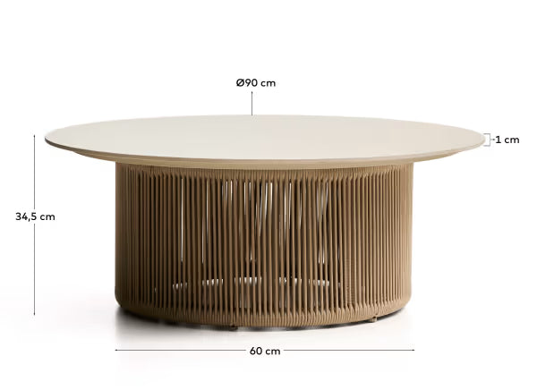 Der Couchtisch Orosei verbindet modernes Design mit Funktionalität und ist ein perfektes Element für sowohl Innen- als auch Außenräume. Hergestellt aus Aluminium und einer keramischen Tischplatte, zeichnet er sich durch einen minimalistischen, skandinavischen Stil aus, der sich in verschiedene Arrangements einfügt. Der handgeflochtene Sockel aus ecrufarbener Schnur verleiht dem Tisch Wärme und einen einzigartigen Charakter, während er gleichzeitig wetterfest ist. Dank der Materialbehandlung ist die Flechtung UV-beständig, was ihre Langlebigkeit und die Erhaltung der Ästhetik über lange Zeit garantiert.
