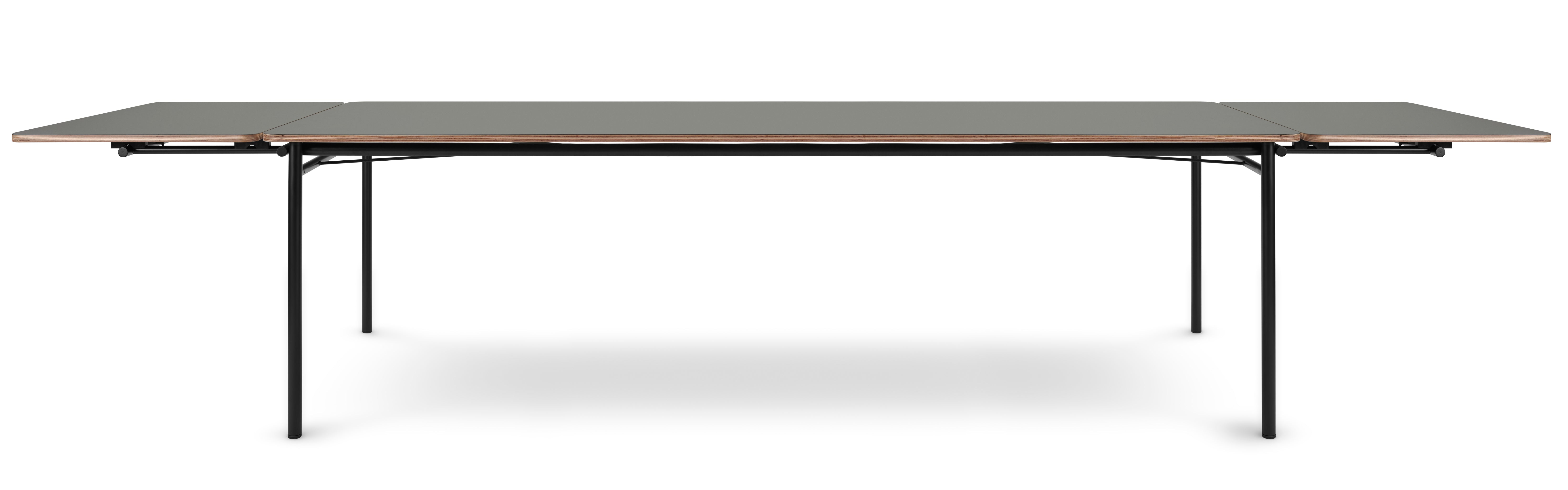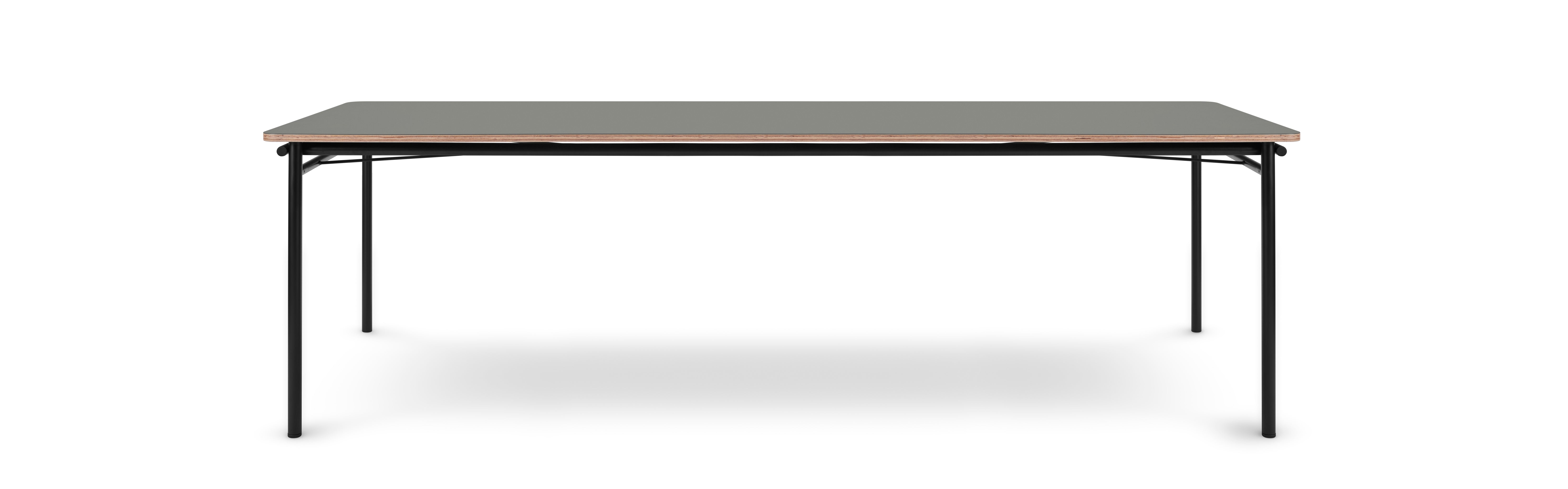 Der Tisch wurde aus langlebigen und robusten Materialien gefertigt, die Widerstandsfähigkeit gegen den täglichen Gebrauch bieten und gleichzeitig ein modernes, elegantes Aussehen bewahren. Die Tischplatte aus Furnier, das mit Linoleum beschichtet ist, ist sowohl ästhetisch als auch praktisch, und die sichtbare Kante aus Sperrholz verleiht ihm einen rohen, industriellen Charakter. Die schlanken, pulverbeschichteten Stahlbeine runden das Gesamtbild ab und machen Taffel zu einem zeitlosen und besonders praktischen Möbelstück.
