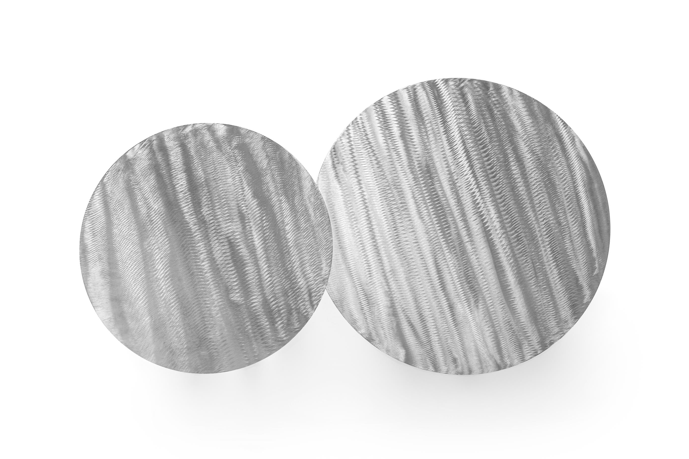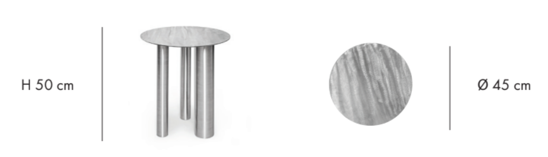 Beistelltisch Brandt CS1 ist ein einzigartiges Möbelstück, inspiriert von der Bauhaus-Bewegung, das moderne Eleganz mit Funktionalität vereint. Der Tisch Brandt CS1 besticht durch sein modernes Design, das rostfreien Stahl mit präzise gestalteten zylindrischen Beinen in unterschiedlichen Durchmessern kombiniert und so eine ausgewogene Asymmetrie schafft. Die Tischplatte des Tisches verfügt über eine handgebürstete Oberfläche, deren Textur an Wellen auf dem Wasser erinnert und jedem Exemplar einen unverwechselbaren Charakter verleiht, wodurch es zu einem funktionalen Kunstwerk wird.