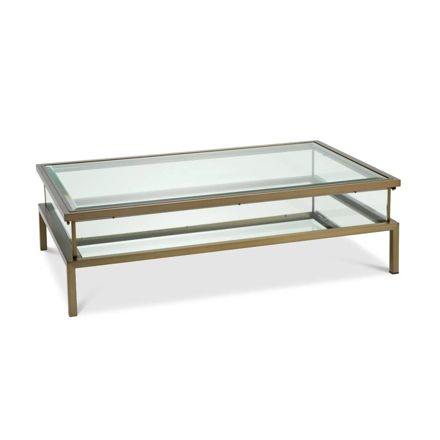 Der Couchtisch Harvey vereint Eleganz und Funktionalität in luxuriösem Design. Seine rechteckige Form und die verschiebbare Tischplatte aus transparentem, gehärtetem Glas machen ihn zum idealen Ort, um Dekorationen, Sammlungen oder Bücher zu präsentieren. Moderner Couchtisch mit einem Gestell aus Edelstahl in gebürsteter Messingausführung verleiht dem Raum Wärme, Raffinesse und edlen Glanz – er passt perfekt zu glamourösen, Art-déco- und modernen klassischen Einrichtungsstilen.