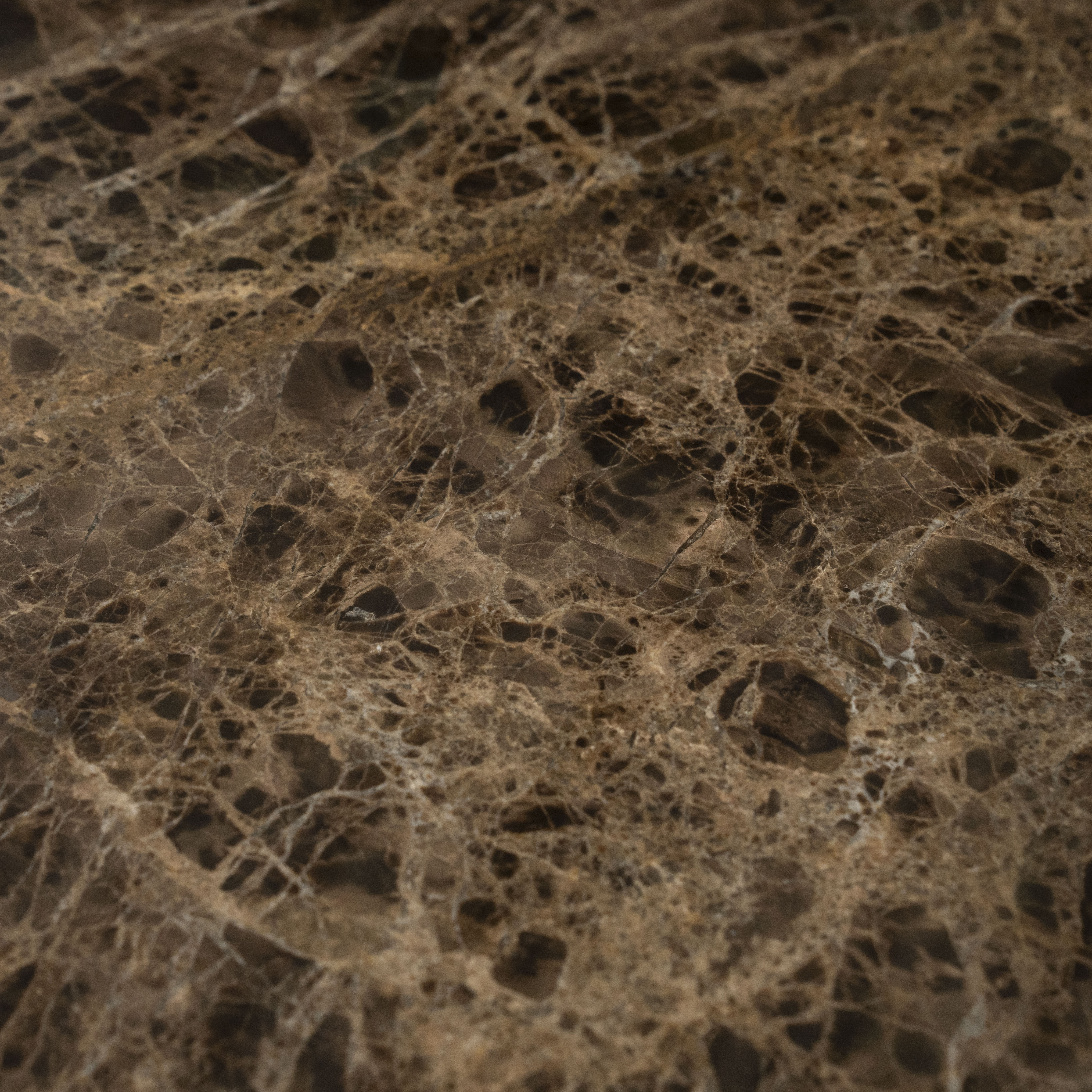 Der Couchtisch Luigi ist ein moderner Akzent mit deutlich luxuriösem Charakter. Die runde Tischplatte aus natürlichem Emperador-Marmor zieht mit ihrem reichen, braunen Muster die Blicke auf sich, während das schwarze Metallgestell ein stilvolles, kontrastierendes Duo bildet. Dieser Marmortisch fügt sich perfekt in moderne, industrielle Innenräume sowie in die Ästhetik des Hotel-Luxus ein und wird zum eleganten Mittelpunkt des Raumes. Jedes Exemplar ist einzigartig dank der unverwechselbaren Maserung des Marmors.