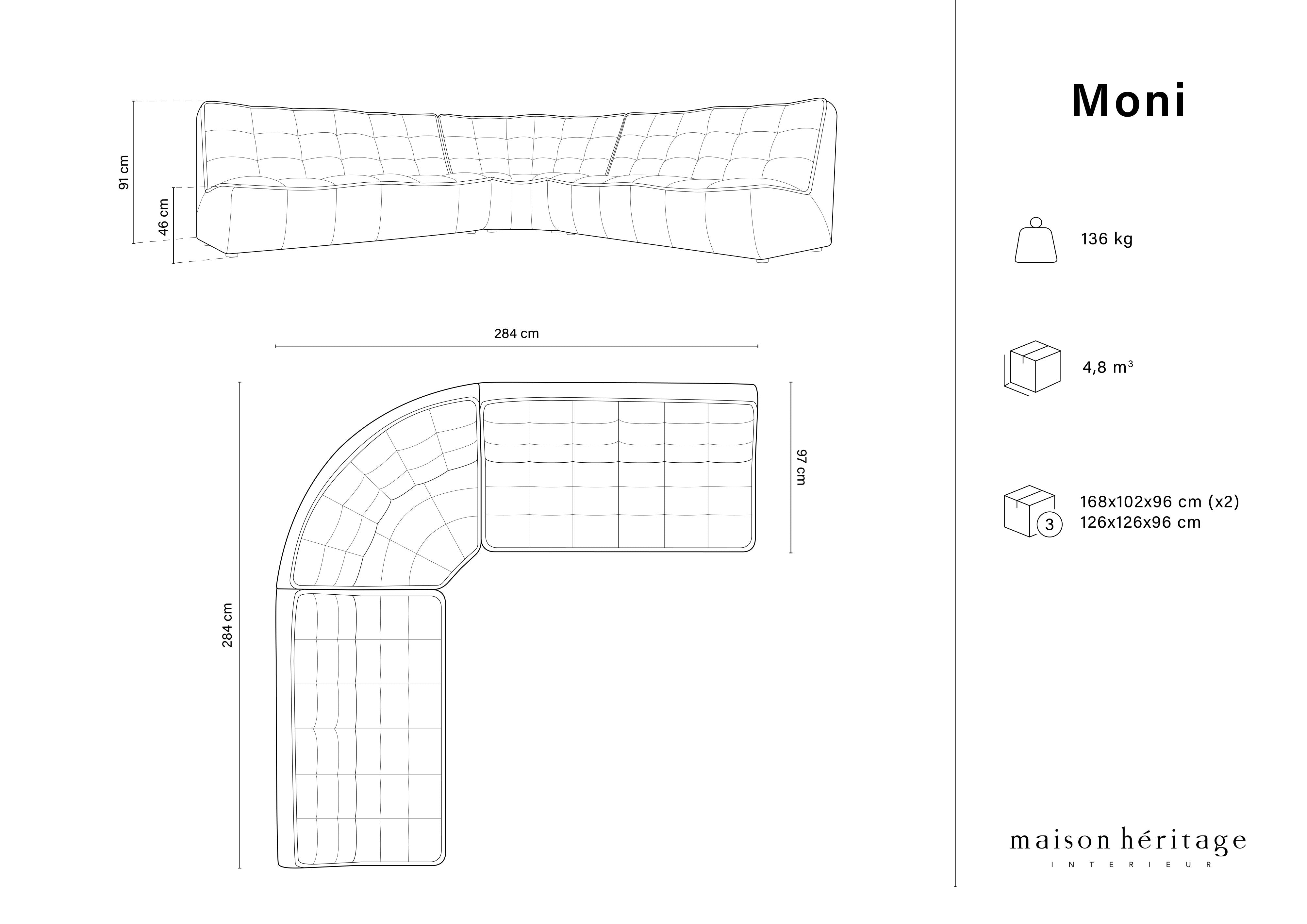 Die Polsterung aus natürlichem Kowid wird sanft gepresst, dank seiner Struktur ist es sehr angenehm angenehm. Ergonomische Formen gewährleisten kostenlose Unterstützung. Die Moni -Kollektion umfasst mehrere Kombinationen von Sofas und Ecken sowie Elemente wie Sessel, Chaise und Poufs.