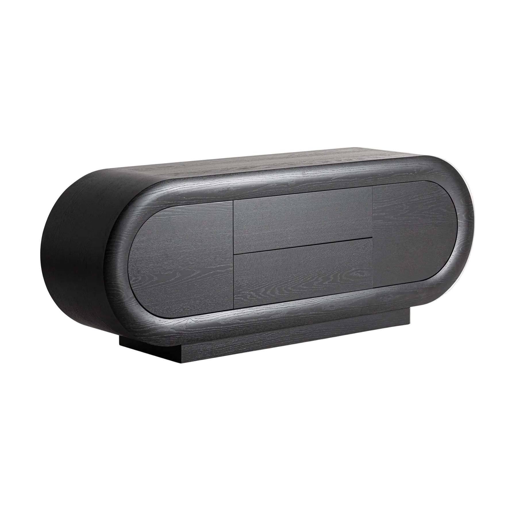 TV-Sideboard Chamonix ist ein modernes und elegantes Möbelstück, das minimalistische Form mit ausdrucksstarkem Charakter verbindet. Hergestellt aus Eichenholz in einem tiefen, schwarzen Finish, besticht es durch die harmonische Kombination von abgerundeten und horizontalen Linien, die ihm Leichtigkeit und visuelle Kohärenz verleihen. Dieses stilvolle TV-Sideboard für das Wohnzimmer eignet sich hervorragend als zentrales Element im Entspannungsbereich und bietet Platz für Multimedia-Geräte sowie Accessoires.