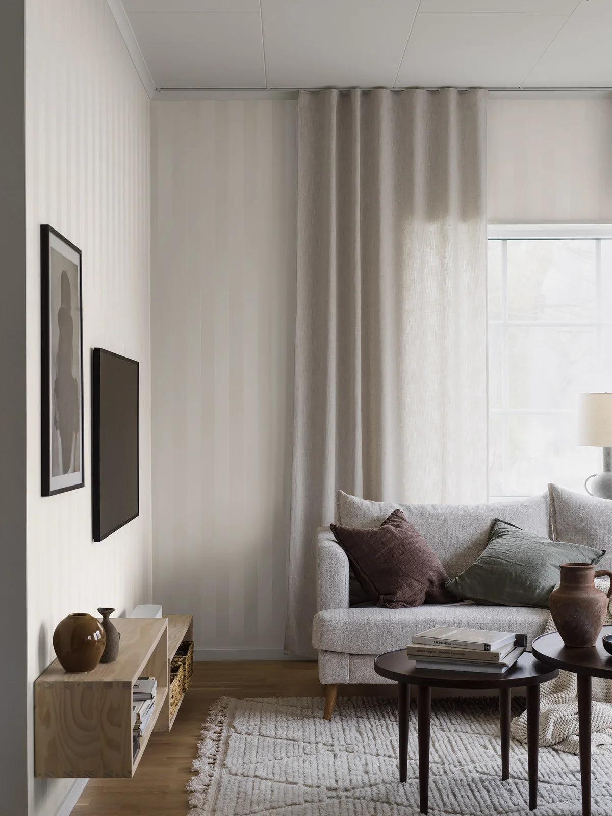 Tapete Karl bringt einen hellen, leichten und ordentlichen Charakter in Ihr Zuhause, ideal für Liebhaber zeitloser Eleganz. Das klassische Muster breiter Streifen wurde subtil gestaltet, sodass abwechselnd matte und sanft glänzende Streifen ein interessantes, jedoch unaufdringliches Spiel von Licht an der Wand erzeugen. Insgesamt präsentiert es sich frisch, sauber und äußerst stilvoll.