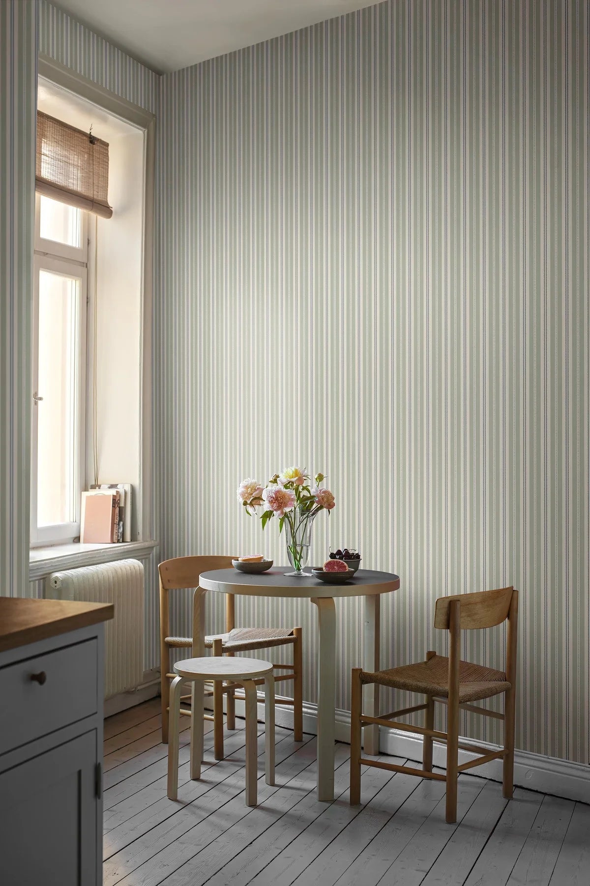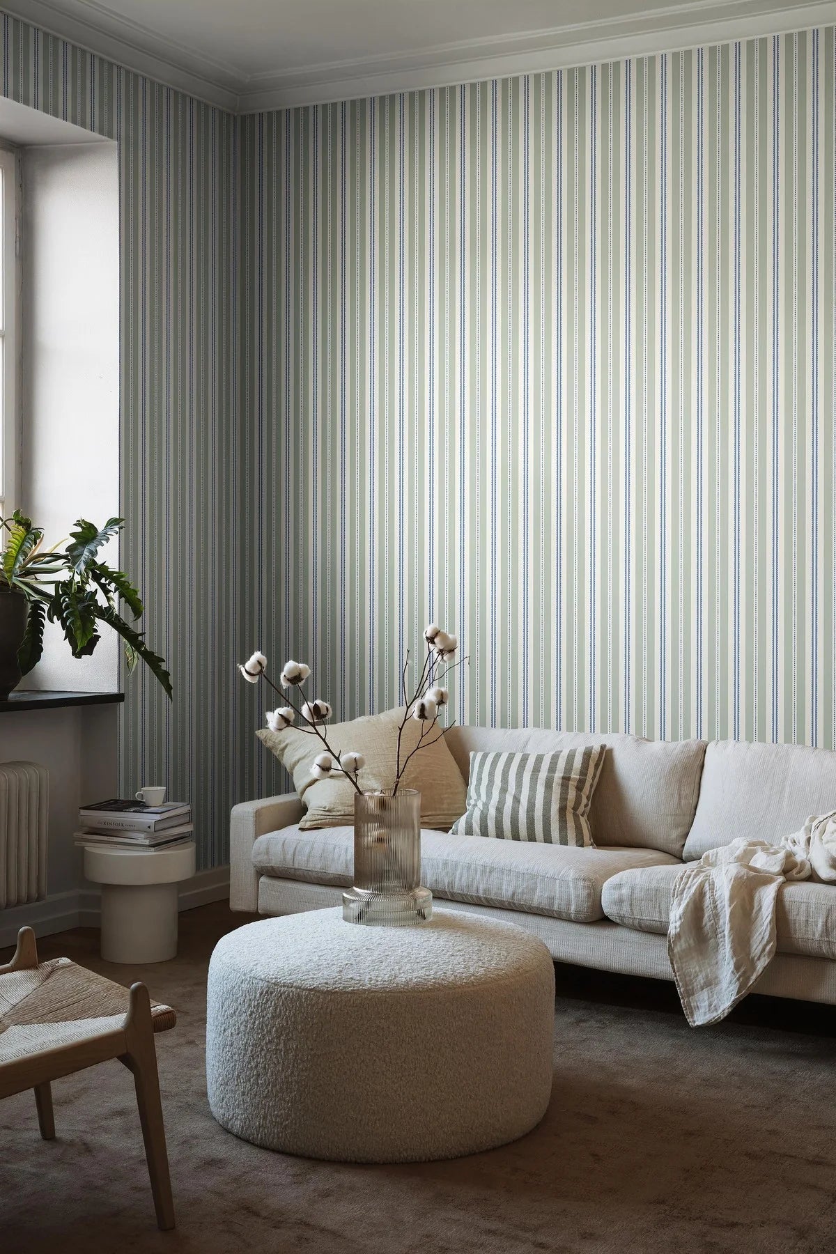 Tapete Hedda ist ein klassisches Streifenmuster, das Leichtigkeit und Frische inspiriert von natürlichem Licht in Ihr Zuhause bringt. Die subtile Komposition aus zarten Linien schafft einen harmonischen und geordneten Raum, während der dekorative Akzent dem Ganzen einen modernen Charakter verleiht. Das Muster verbindet zeitlose Ästhetik mit einem Hauch zeitgenössischer Freiheit, wodurch es sich hervorragend in verschiedenen Arrangements einfügt.