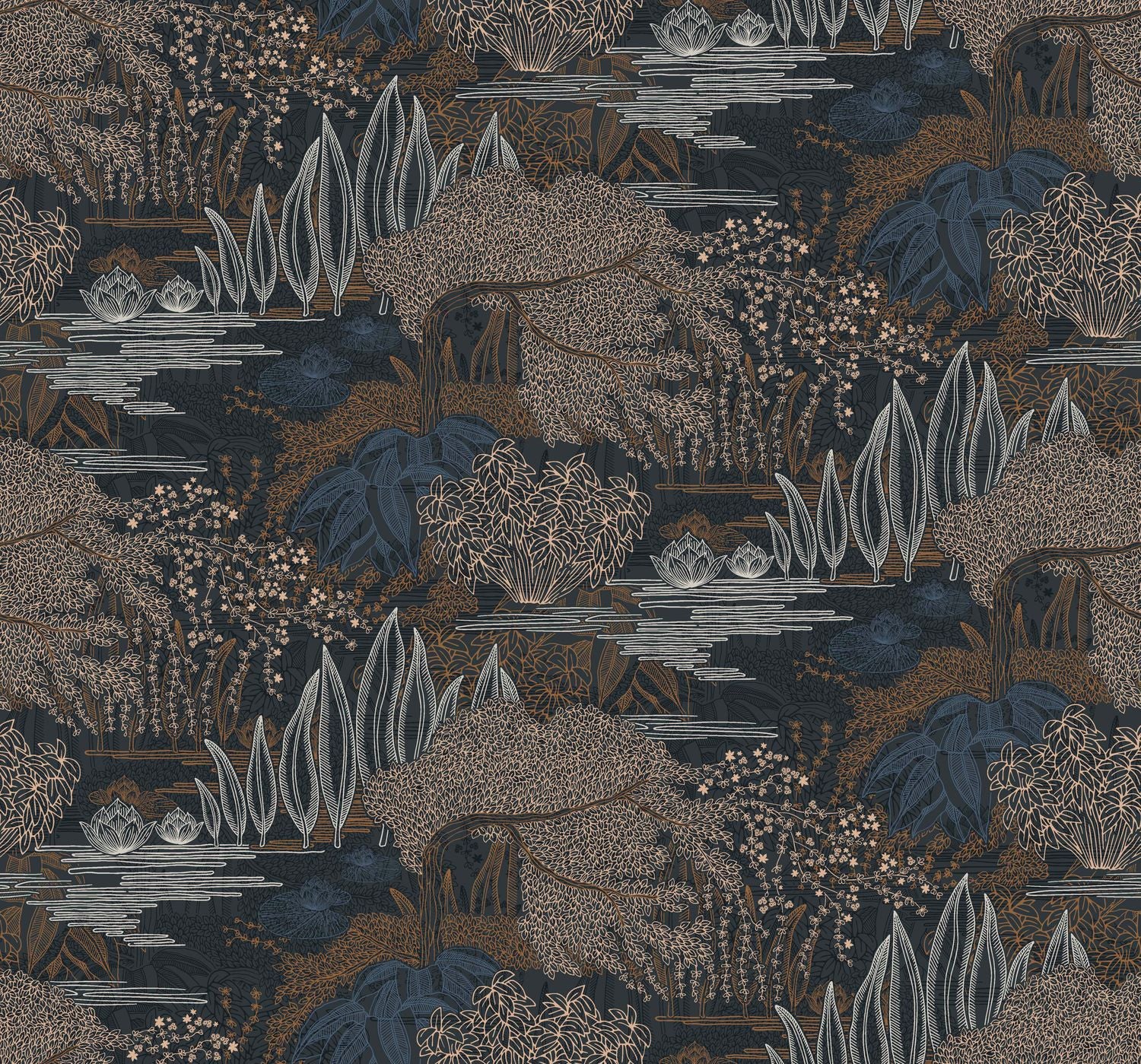Tapete mit pflanzlichem Landschaftsmotiv des Wassergartens JASMIN - ENCRE/CUIVRE schwarz mit braun