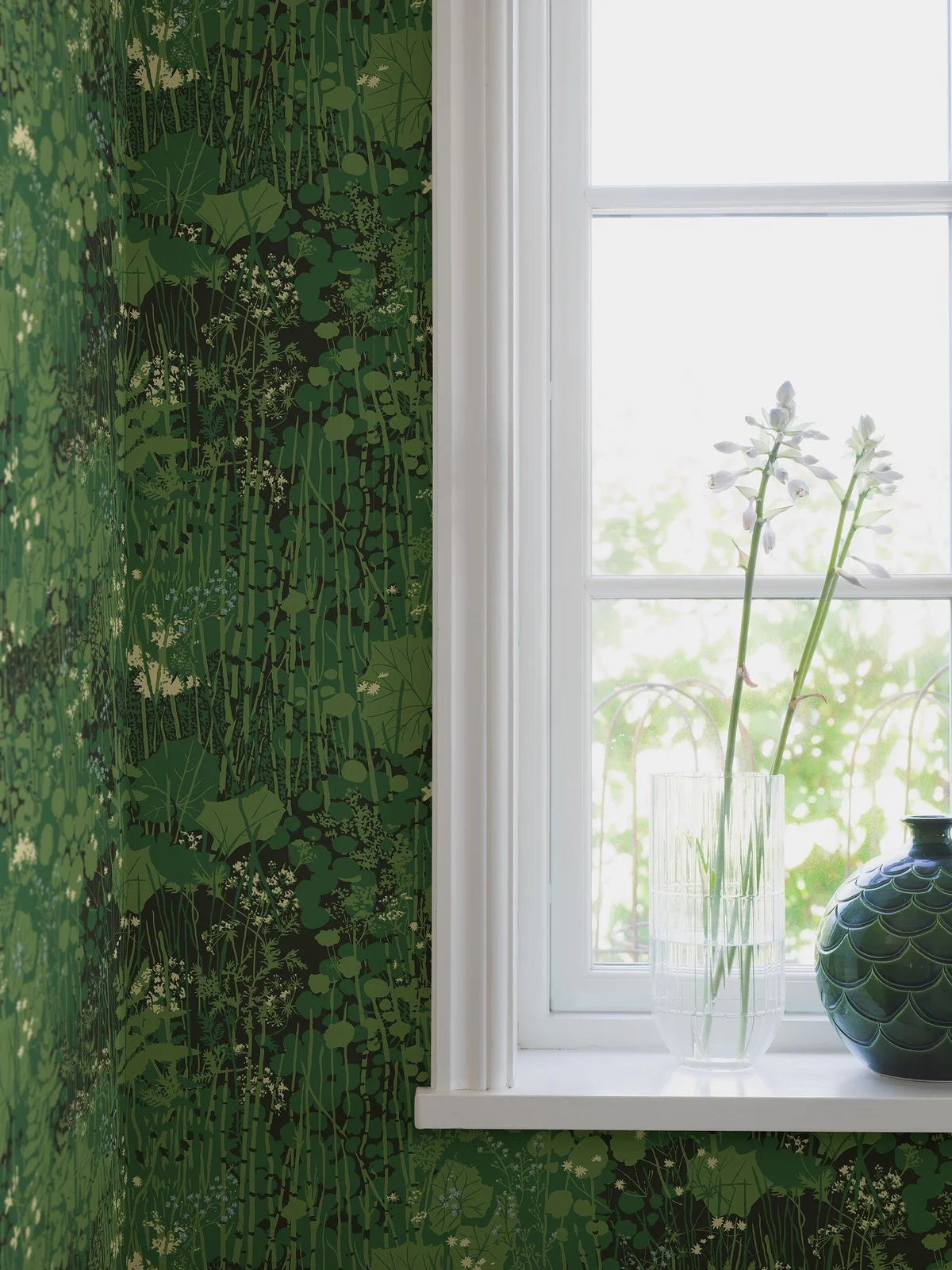 Tapete Dikesren ist eine Hommage an die Natur, die dank des Pflanzenmotivs an den Wänden zum Leben erwacht. Inspiriert von einer üppigen, grünen Küste zeigt die Tapete Farne, Vergissmeinnichte und wilde Blumen vor einem tiefgrünen Hintergrund. In der Technik des Oberflächen-Drucks gefertigt, bringt die Tapete eine reiche Textur und die Ruhe eines skandinavischen Sommers in den Raum.
