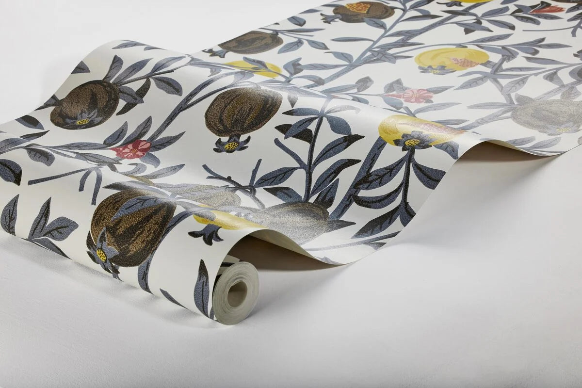 Die Tapete Granatäpple ist eine außergewöhnliche Verbindung von Natur und künstlerischem Handwerk, die die exotische Schönheit des Musters an die Wände bringt. Die Farbgebung schafft ein zartes, aber ausdrucksstarkes Muster von sich windenden Zweigen und reifen Granatäpfeln. Dieses ikonische Textilmuster ist nun zur Wandkunst geworden und verwandelt Innenräume in Räume voller klassischer Eleganz.
